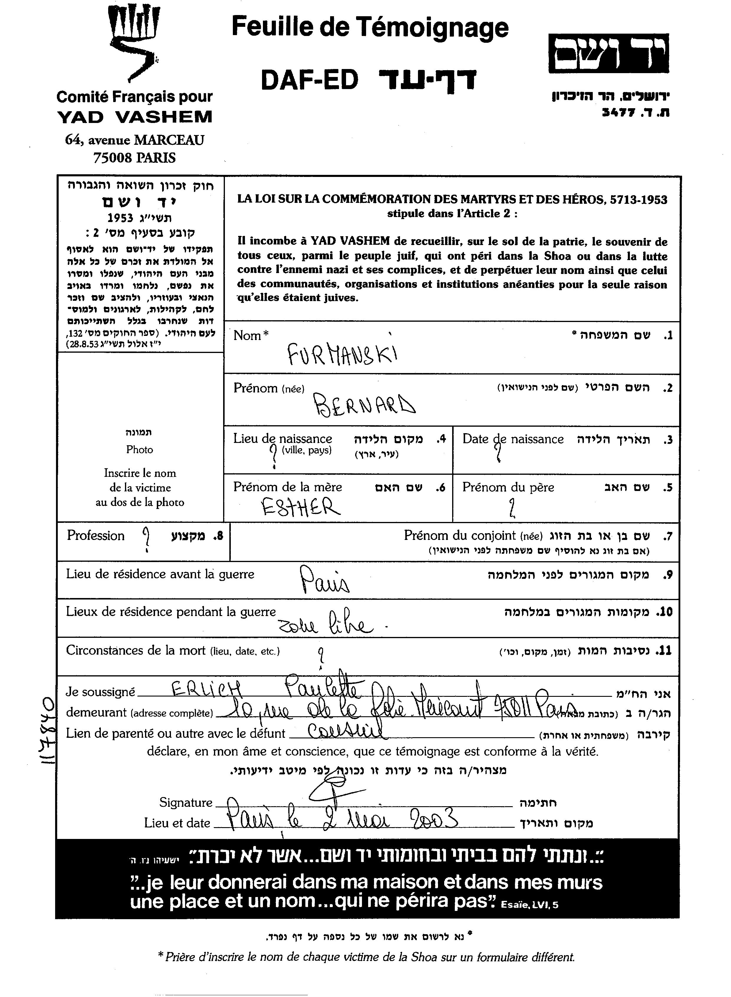 Bernard Furmanski wurde Er war der Sohn von Esther. Vor dem Zweiten Weltkrieg lebte er in Paris, Frankreich.