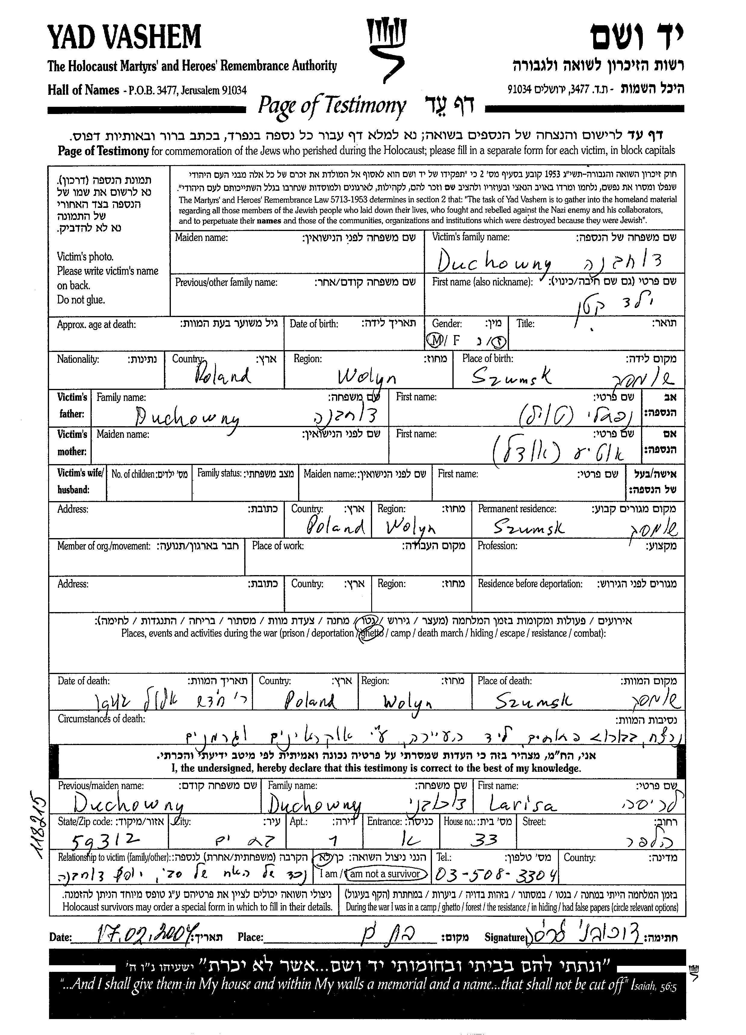 Vorname unbekannt Duchowny wurde in Szumsk, Polen geboren. Er war der Sohn von Tul und Otie Udel. Er war Kind. Vor dem Zweiten Weltkrieg lebte er in Szumsk, Polen. Während des Krieges war er in Getto.