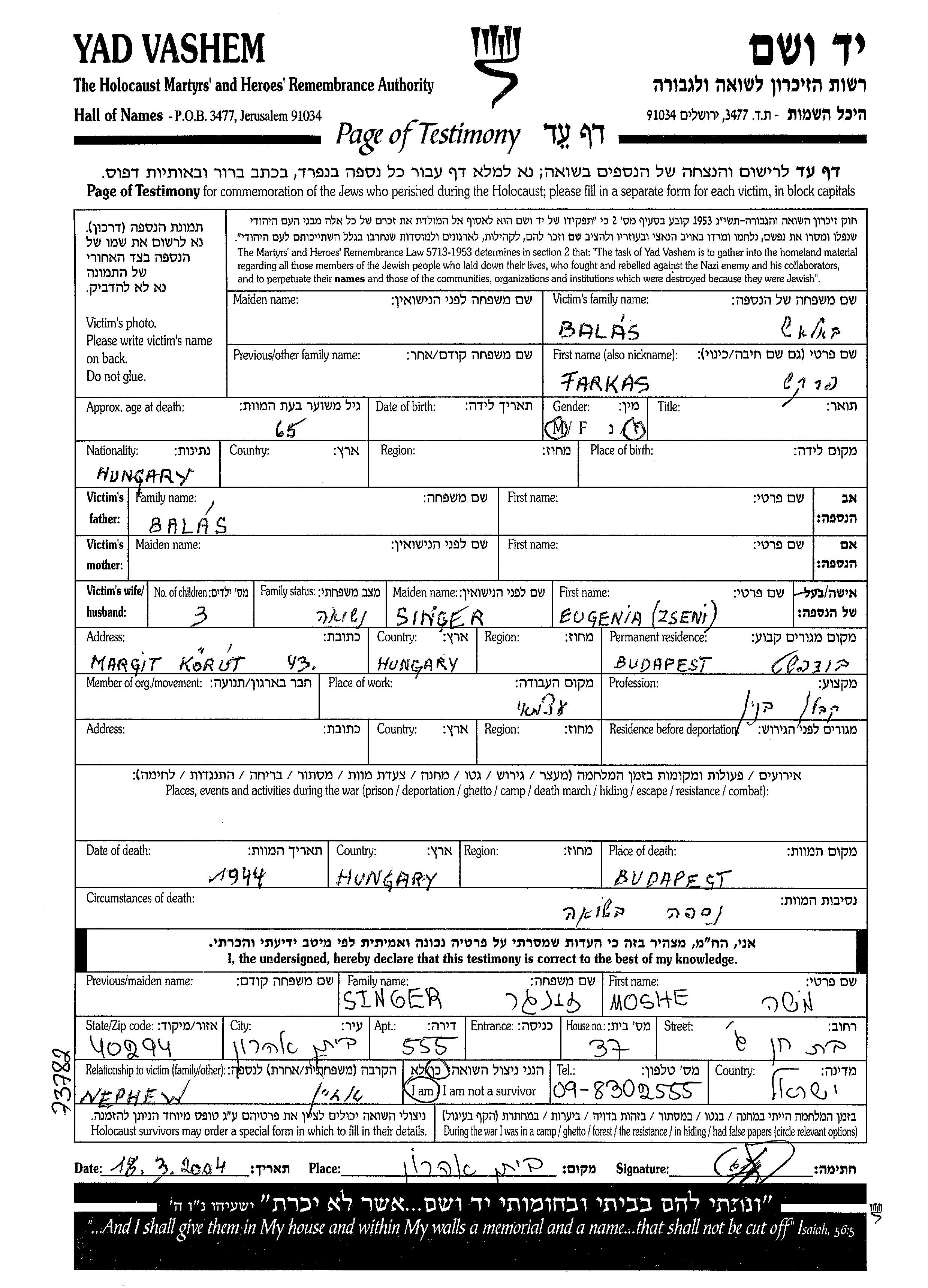 Farkas wurde in der Schoah ermordet. Todesort: Budapest, Ungarn im Jahr 1944.