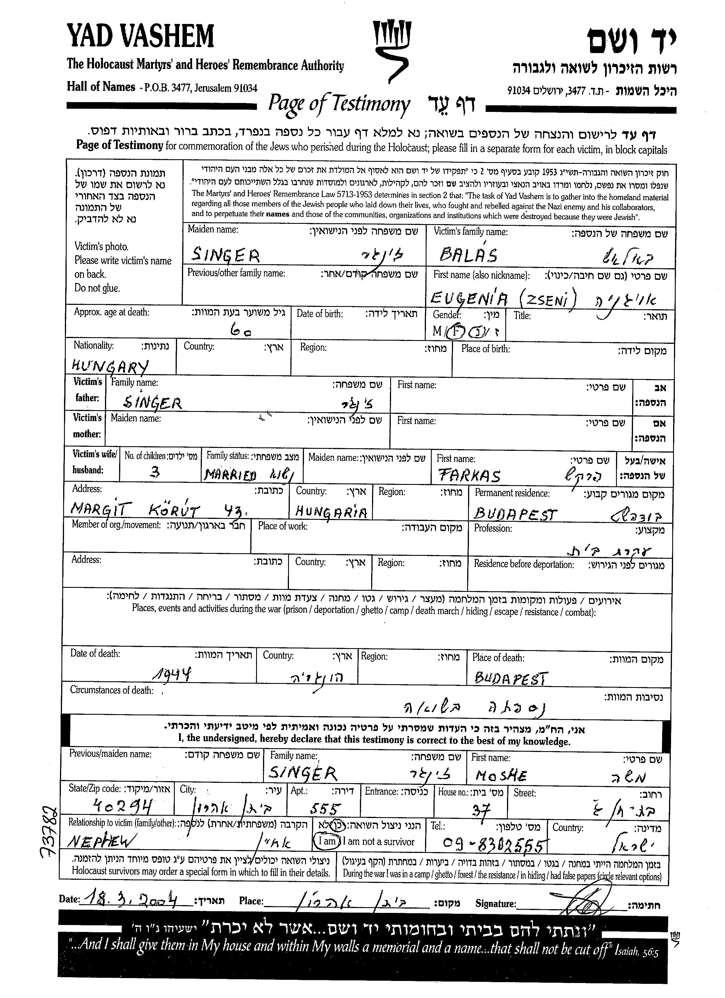 Zseni wurde in der Schoah ermordet. Todesort: Budapest, Ungarn im Jahr 1944.