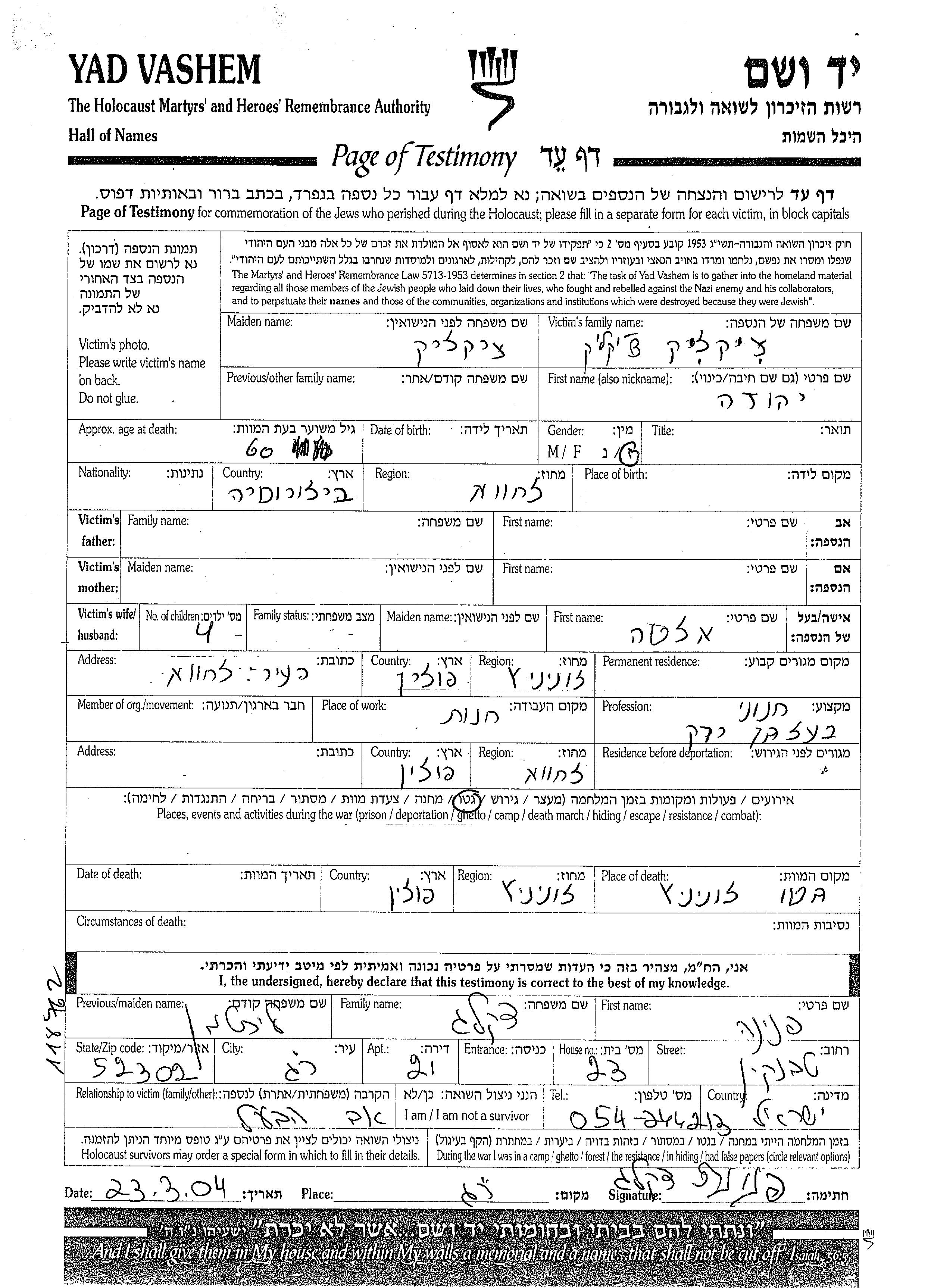 Yehuda Tziklik wurde in Lachwa, Polen geboren. Er war Lebensmittelhändler/-in und mit Alte Verheiratet. Vor dem Zweiten Weltkrieg lebte er in Lachwa, Polen. Während des Krieges war er in Luniniec, Polen.