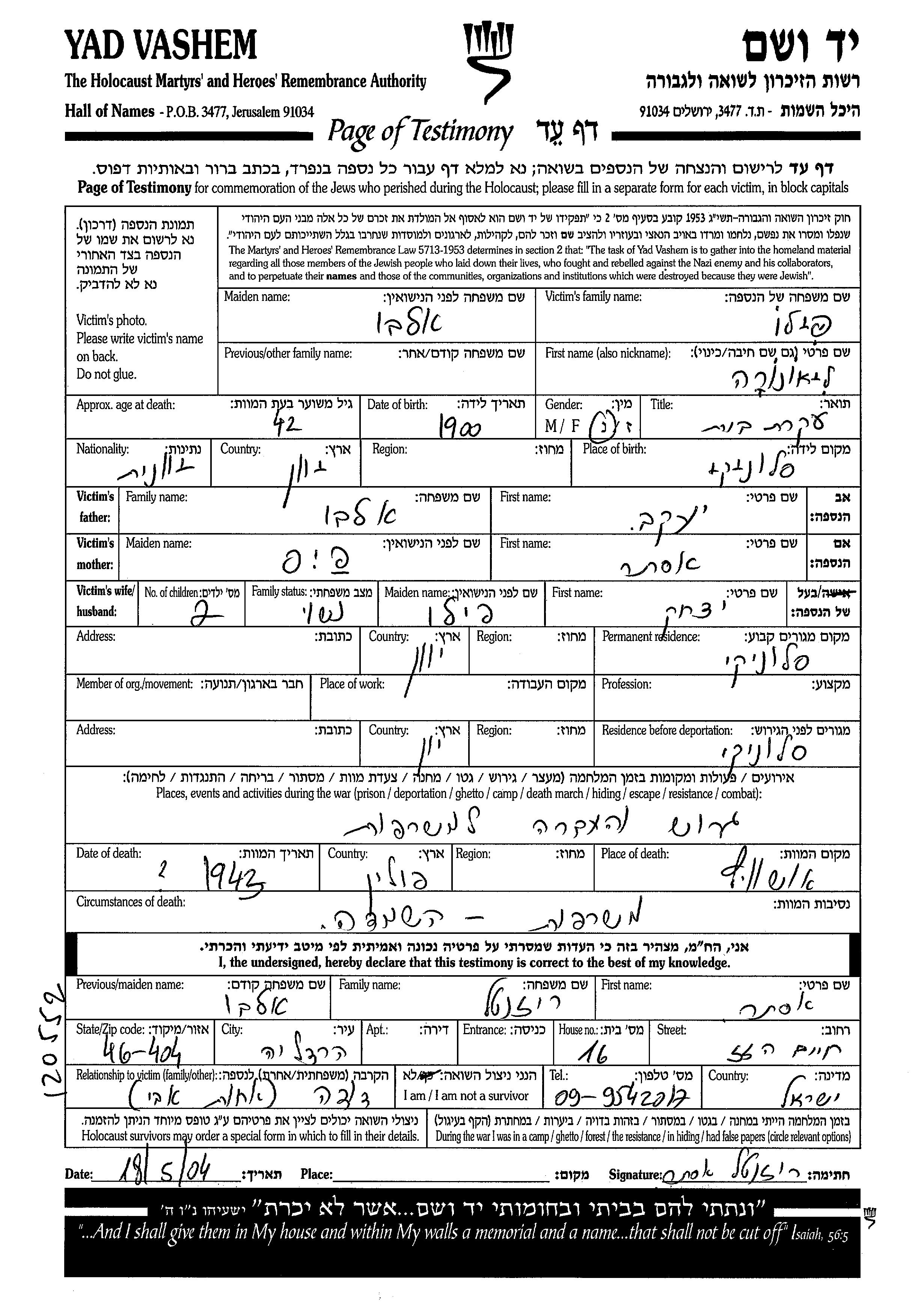 Lionora Pilo, geb. Alvo wurde im Jahr 1900 in Saloniki, Griechenland geboren. Sie war die Tochter von Yaakov und Ester, geb. Fis. Sie war mit Yitzkhak Verheiratet. Vor dem Zweiten Weltkrieg lebte sie in Saloniki, Griechenland. Während des Krieges war sie in Saloniki, Griechenland.