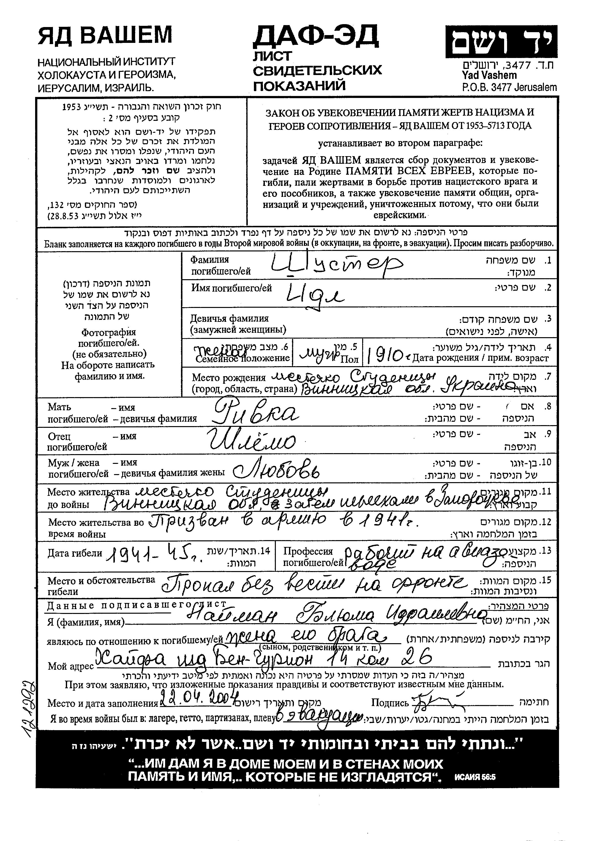 Idl Shuster wurde im Jahr 1910 in Studenitsa, Ukraine (UdSSR) geboren. Er war der Sohn von Shlyomo und Rivka. Er war Rabochi aviazavoda und mit Lyubov Verheiratet. Vor dem Zweiten Weltkrieg lebte er in Studenitsa, Ukraine (UdSSR). Während des Krieges war er in die Sowjetischen Streitkräfte.