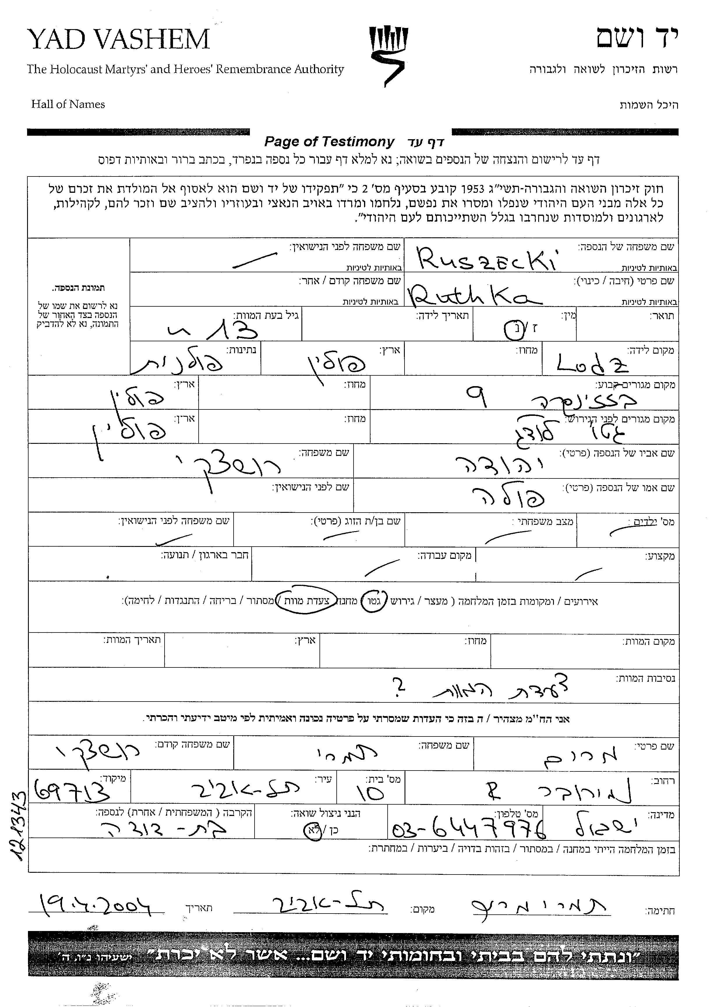Ruthka wurde in der Schoah ermordet.