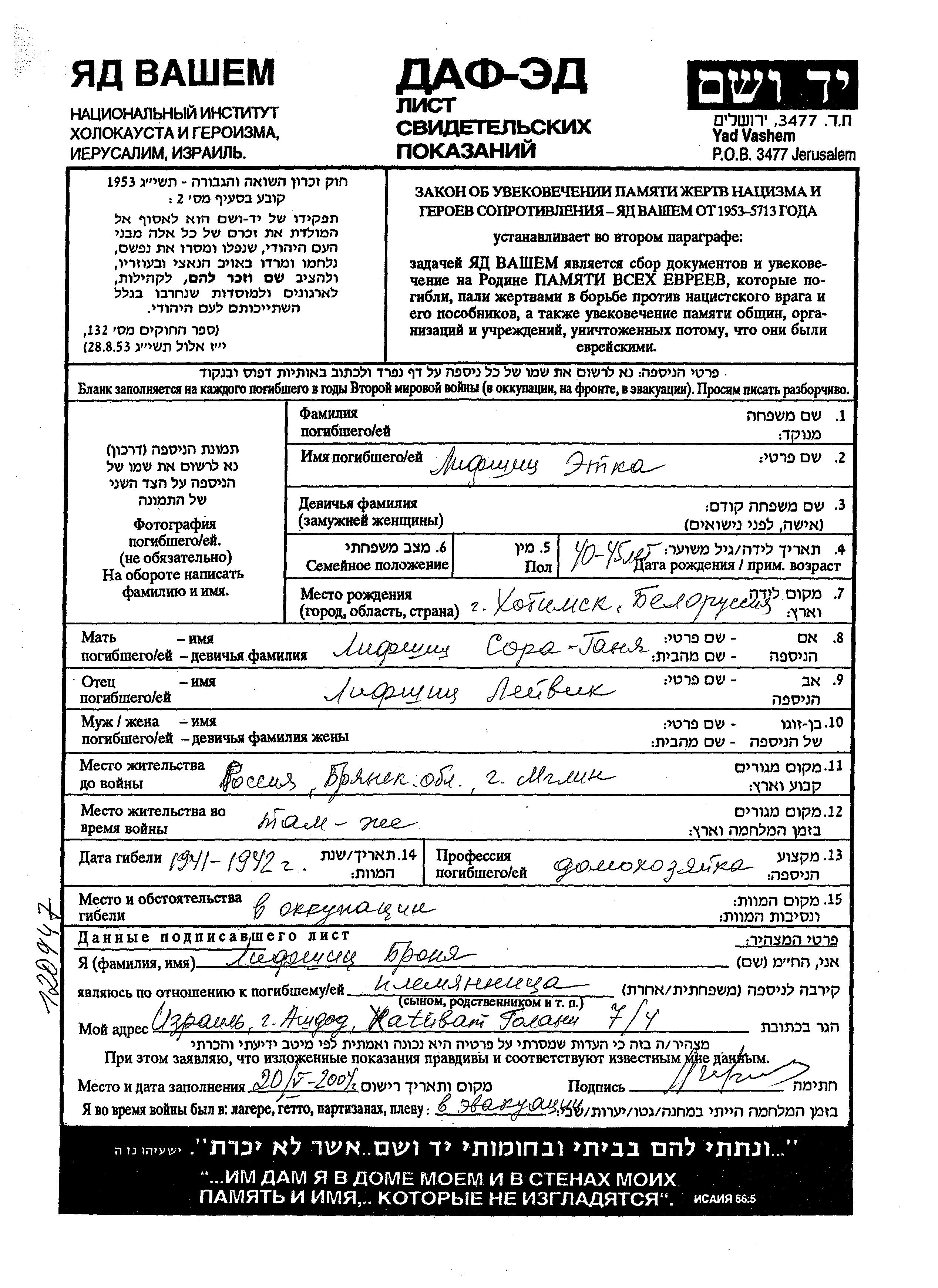 Etka Livshitz wurde im Jahr 1902 in Khotimsk, Weißrussland (UdSSR) geboren. Sie war die Tochter von Leivik und Gania Sora. Sie war Hausfrau. Vor dem Zweiten Weltkrieg lebte sie in Mglin, Russland (UdSSR). Während des Krieges war sie in Mglin, Russland (UdSSR).