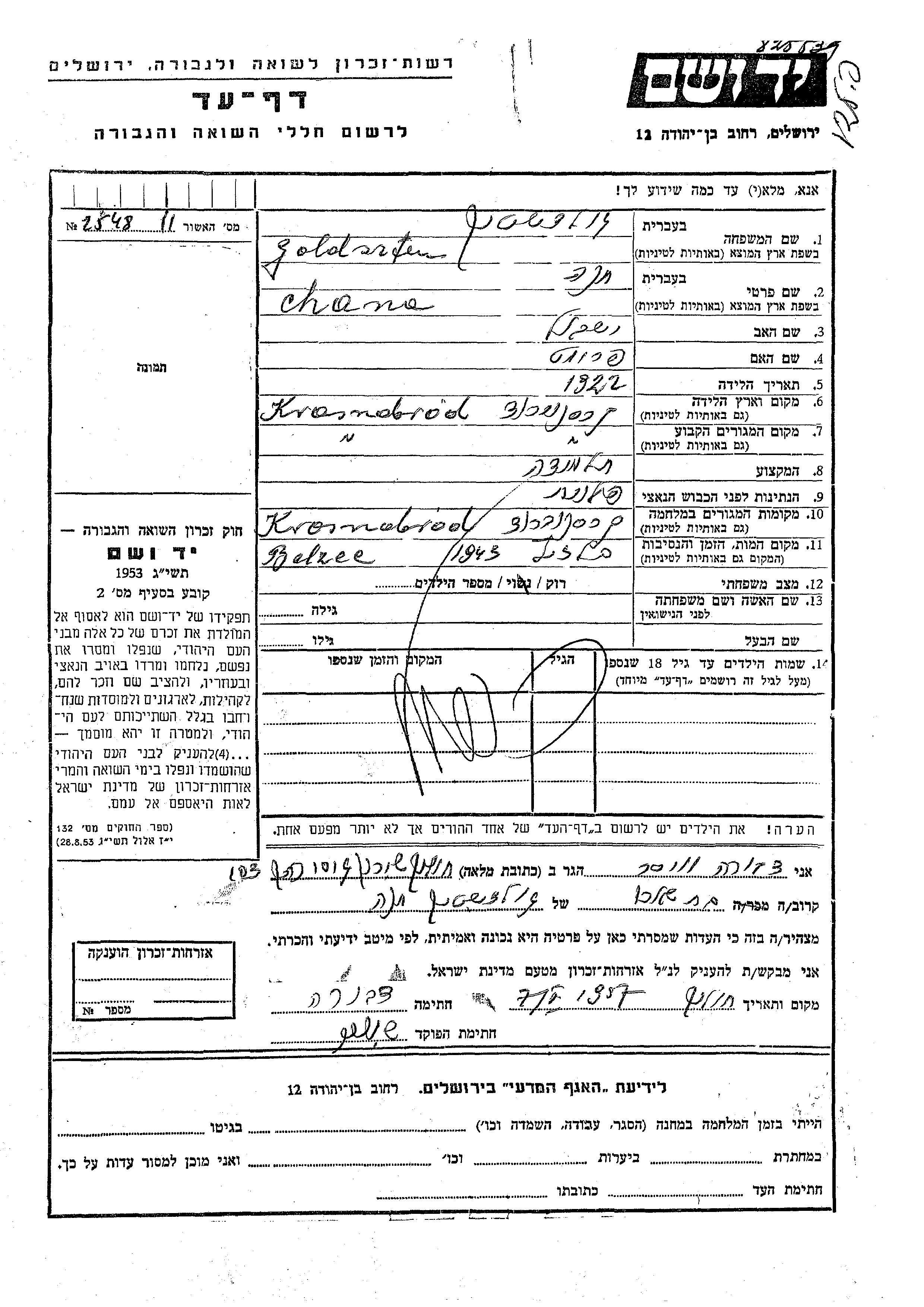 Chana Goldsztein wurde im Jahr 1922 in Krasnobrod, Polen geboren. Sie war die Tochter von Yisrael und Frumet. Sie war Schüler/-in und Ledig. Vor dem Zweiten Weltkrieg lebte sie in Krasnobrod, Polen. Während des Krieges war sie in Krasnobrod, Polen.