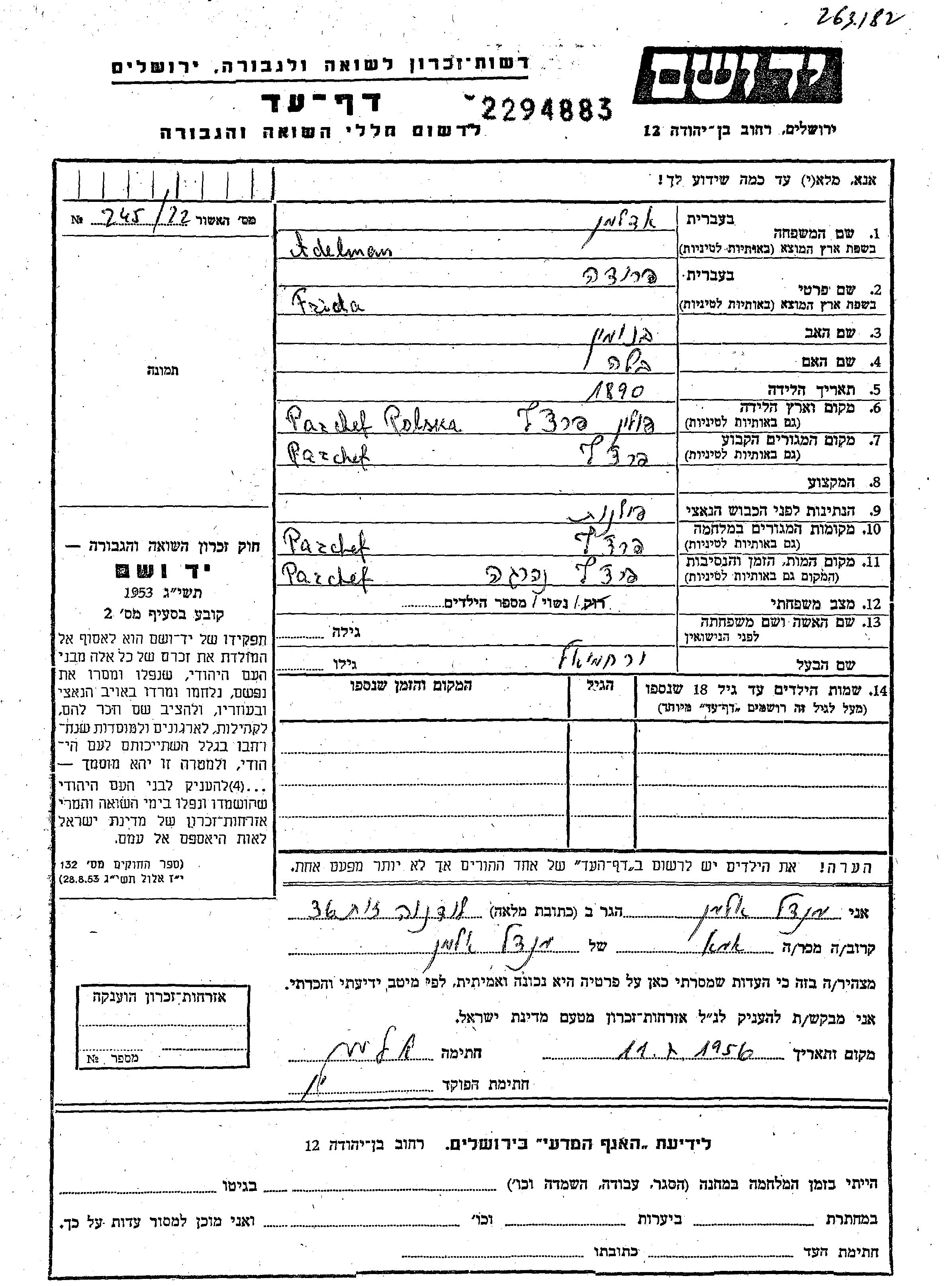 Frida Edelman wurde im Jahr 1890 in Parczew, Polen geboren. Sie war die Tochter von Beniamin und Bela. Sie war mit Yerakhmiel Verheiratet. Vor dem Zweiten Weltkrieg lebte sie in Parczew, Polen. Während des Krieges war sie in Parczew, Polen.