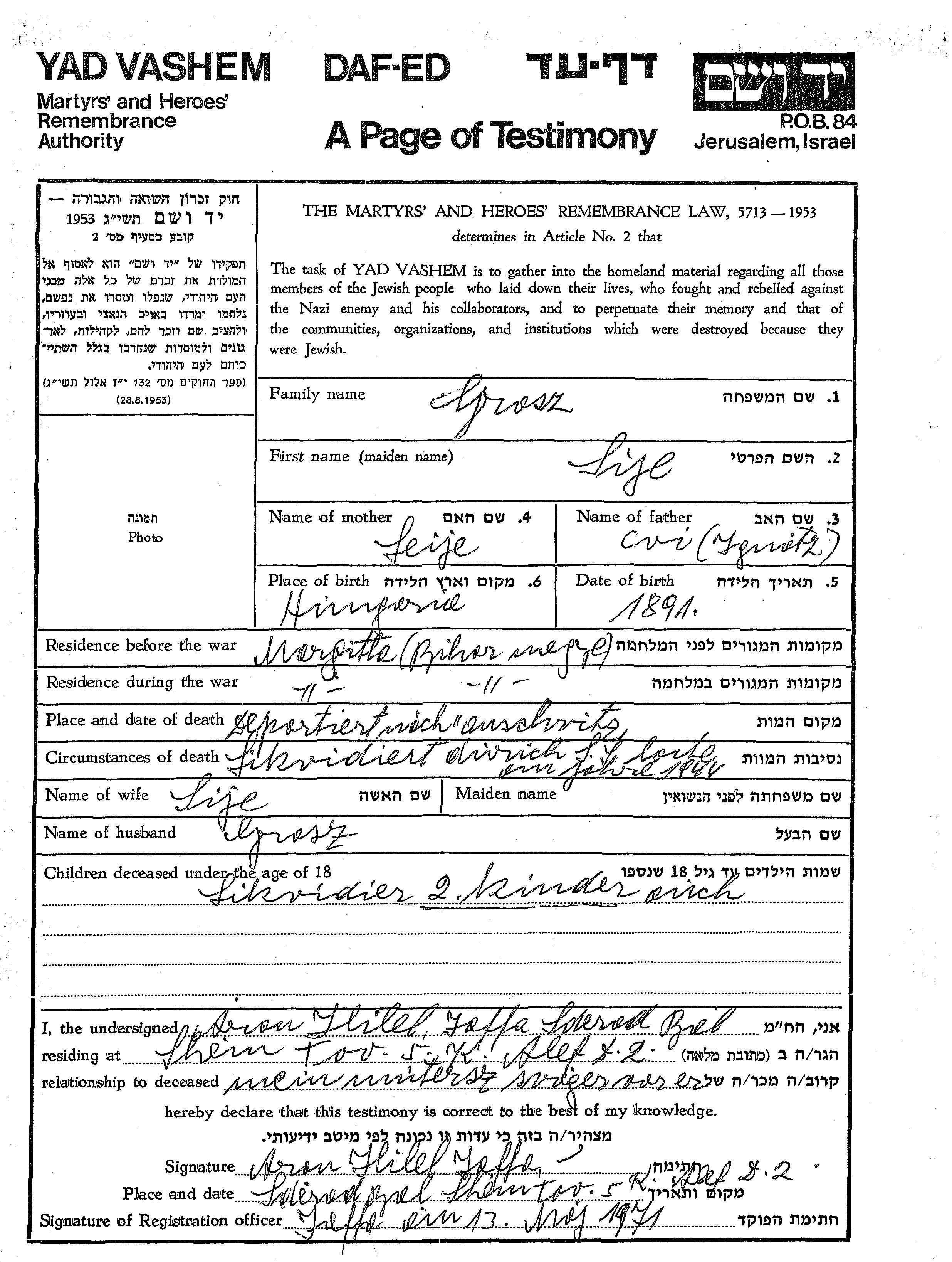 Sije wurde in der Schoah ermordet. Todesort: Auschwitz, Polen im Jahr 1944.