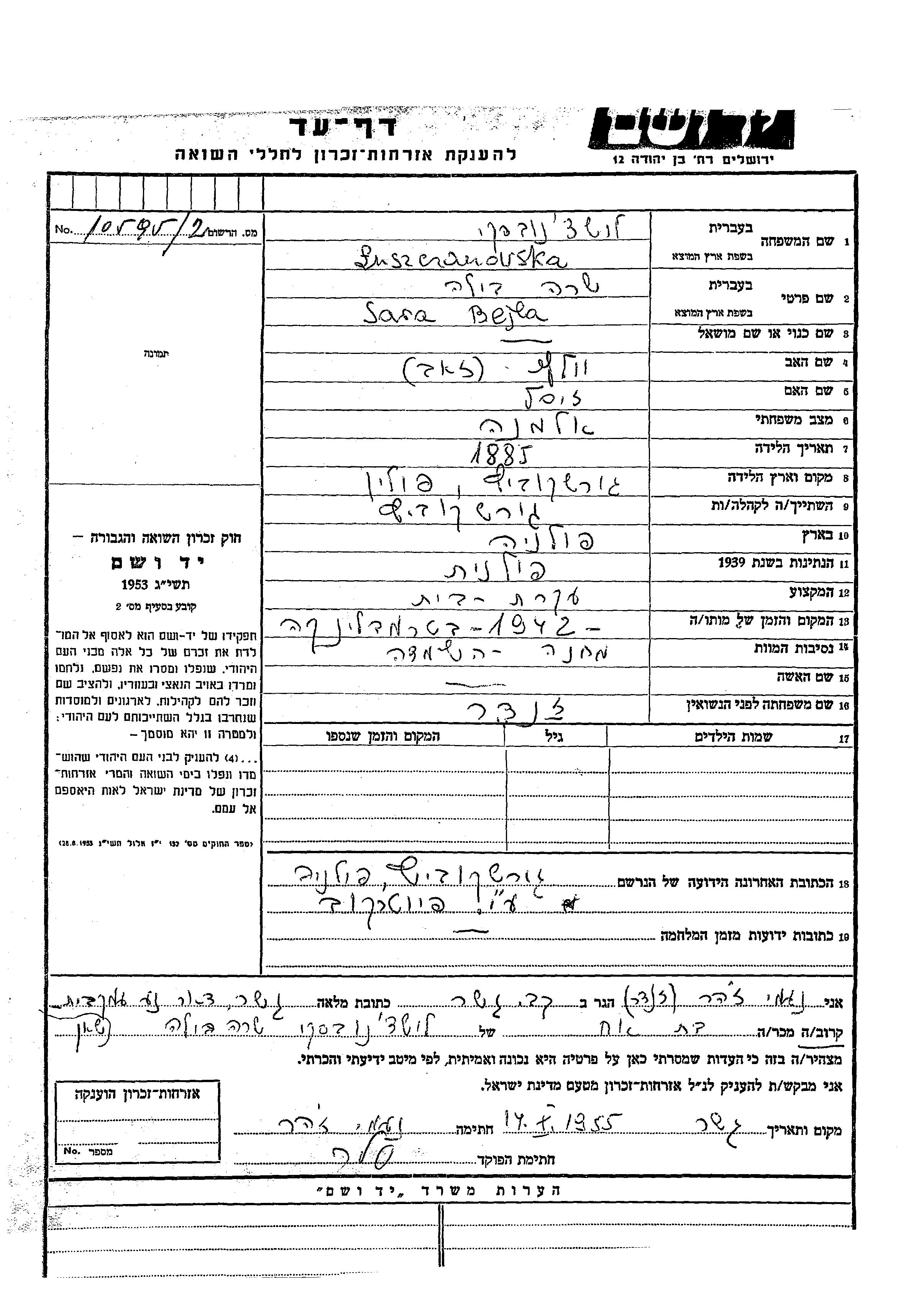 Bejla Sara Lushchanovski, geb. Zander wurde im Jahr 1885 in Gerszkovice, Polen geboren. Sie war die Tochter von Zeev Volf und Zysl. Sie war Hausfrau und Witwe. Vor dem Zweiten Weltkrieg lebte sie in Gerszkovice, Polen.