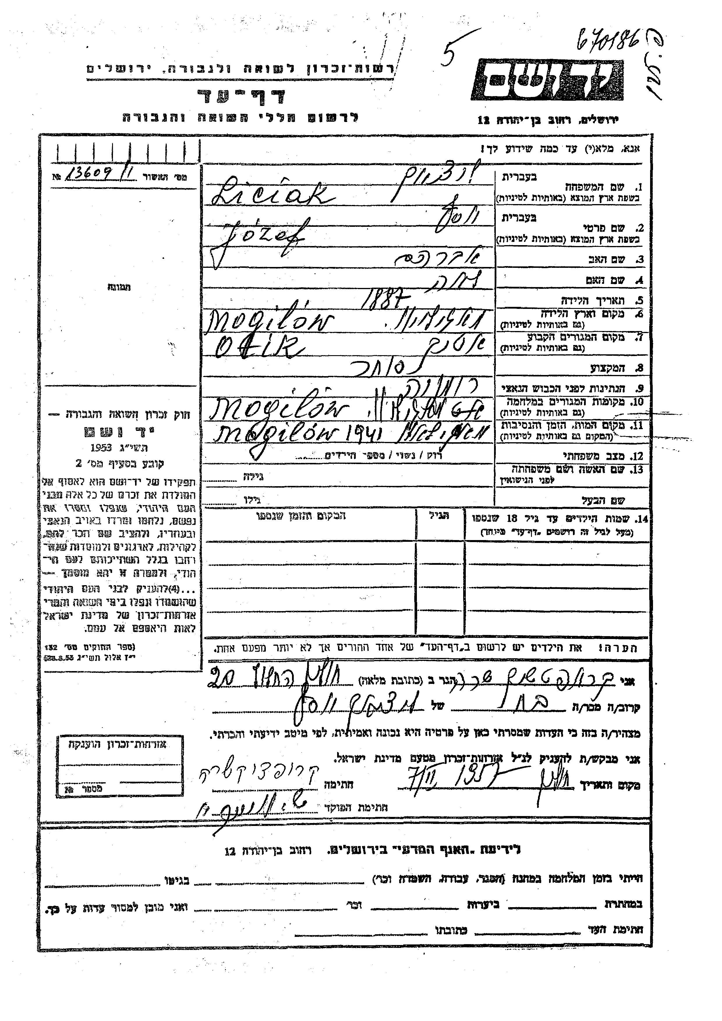 Yosef Liciak wurde im Jahr 1887 in Mogilev Podolski, Ukraine (UdSSR) geboren. Er war der Sohn von Avraham und Lea. Er war Kaufmann/-frau und Verheiratet. Vor dem Zweiten Weltkrieg lebte er in Otik, Rumänien. Während des Krieges war er in Mogilev Podolski, Ukraine (UdSSR).