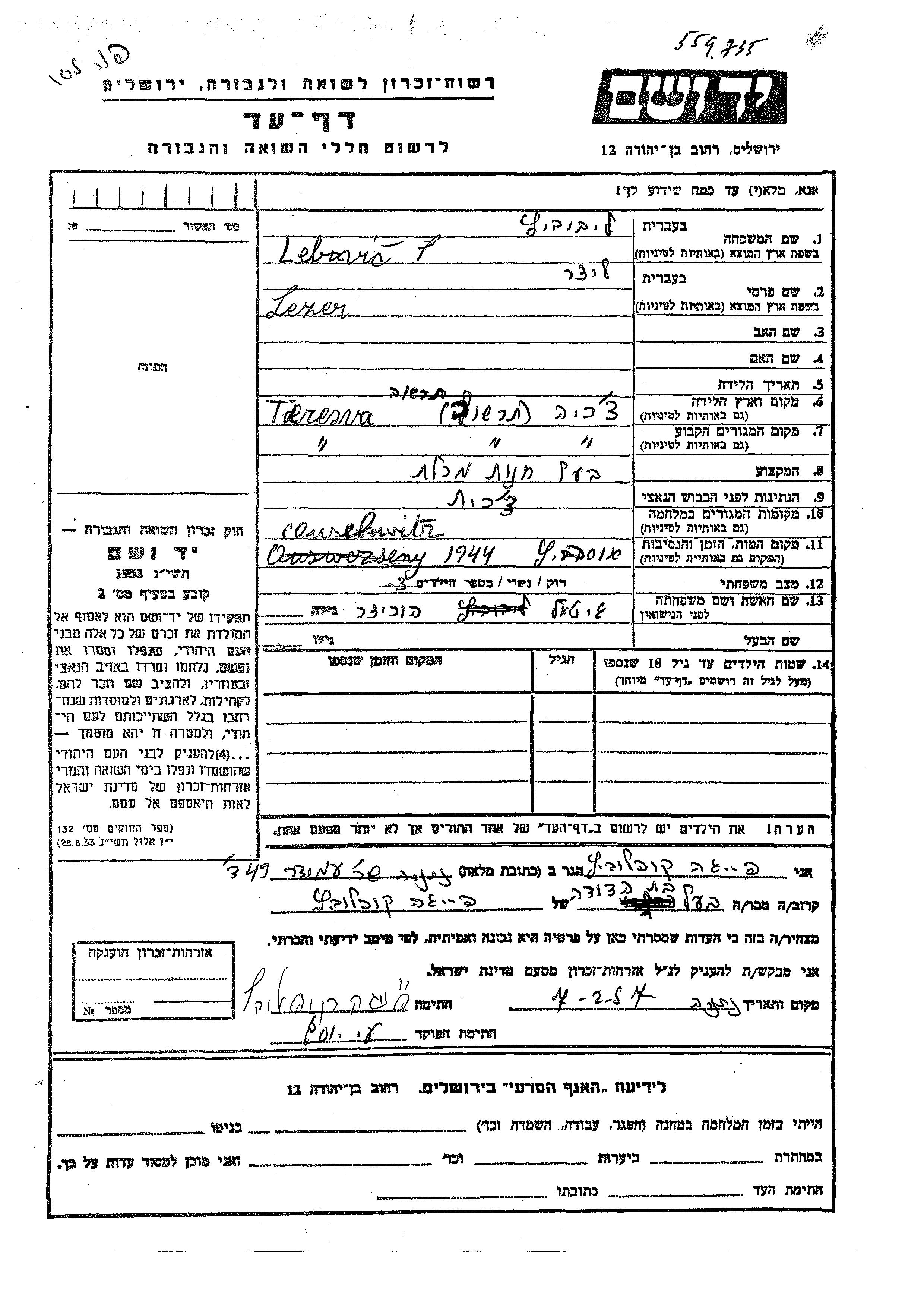 Lezer wurde in der Schoah ermordet. Todesort: Auschwitz, Polen im Jahr 1944.