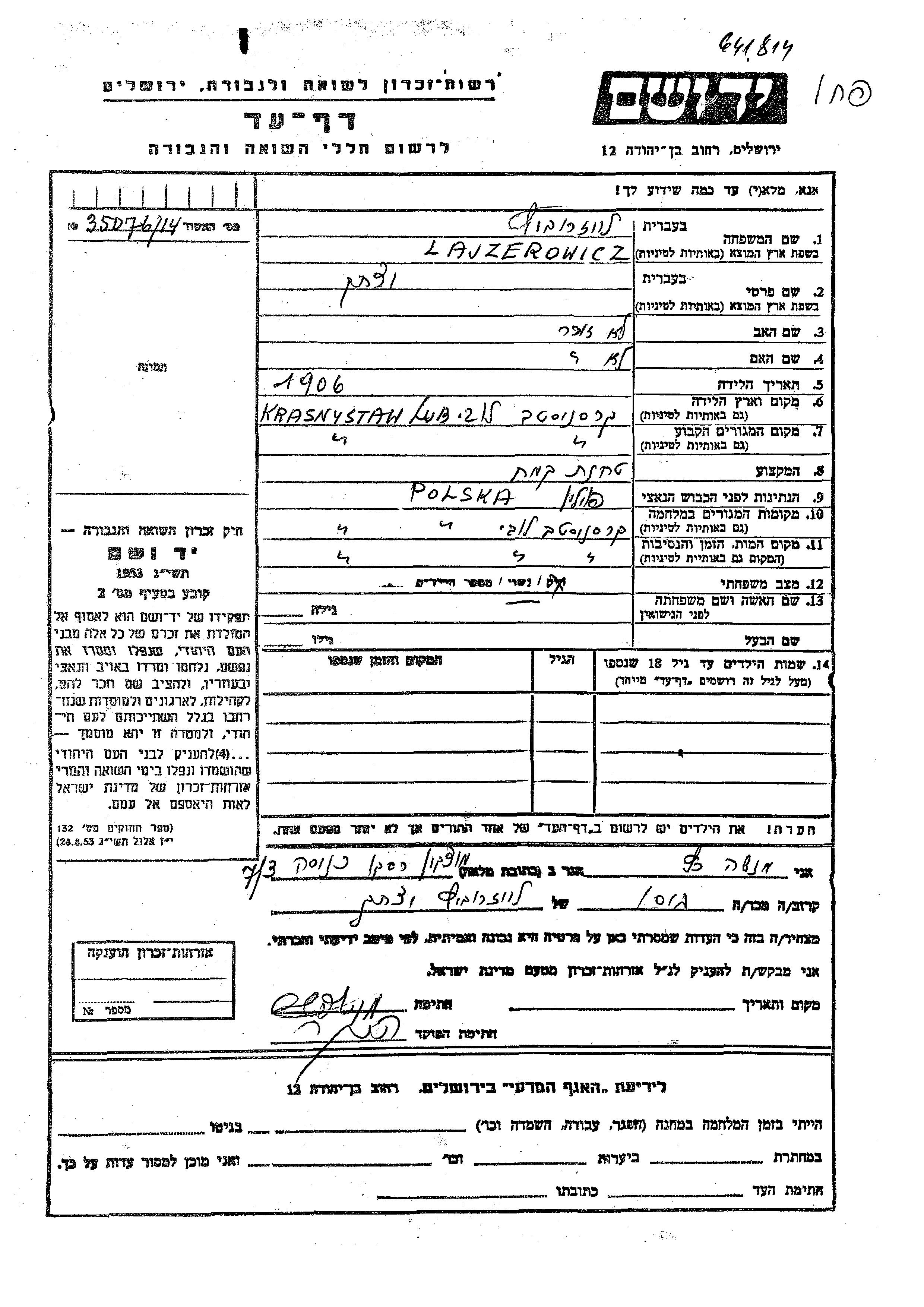 Yitzkhak Leizerovitz wurde im Jahr 1904 in Krasnystaw, Polen geboren. Er war Mühlenbesitzer/-in und Verheiratet. Vor dem Zweiten Weltkrieg lebte er in Krasnystaw, Polen. Während des Krieges war er in Krasnystaw, Polen.