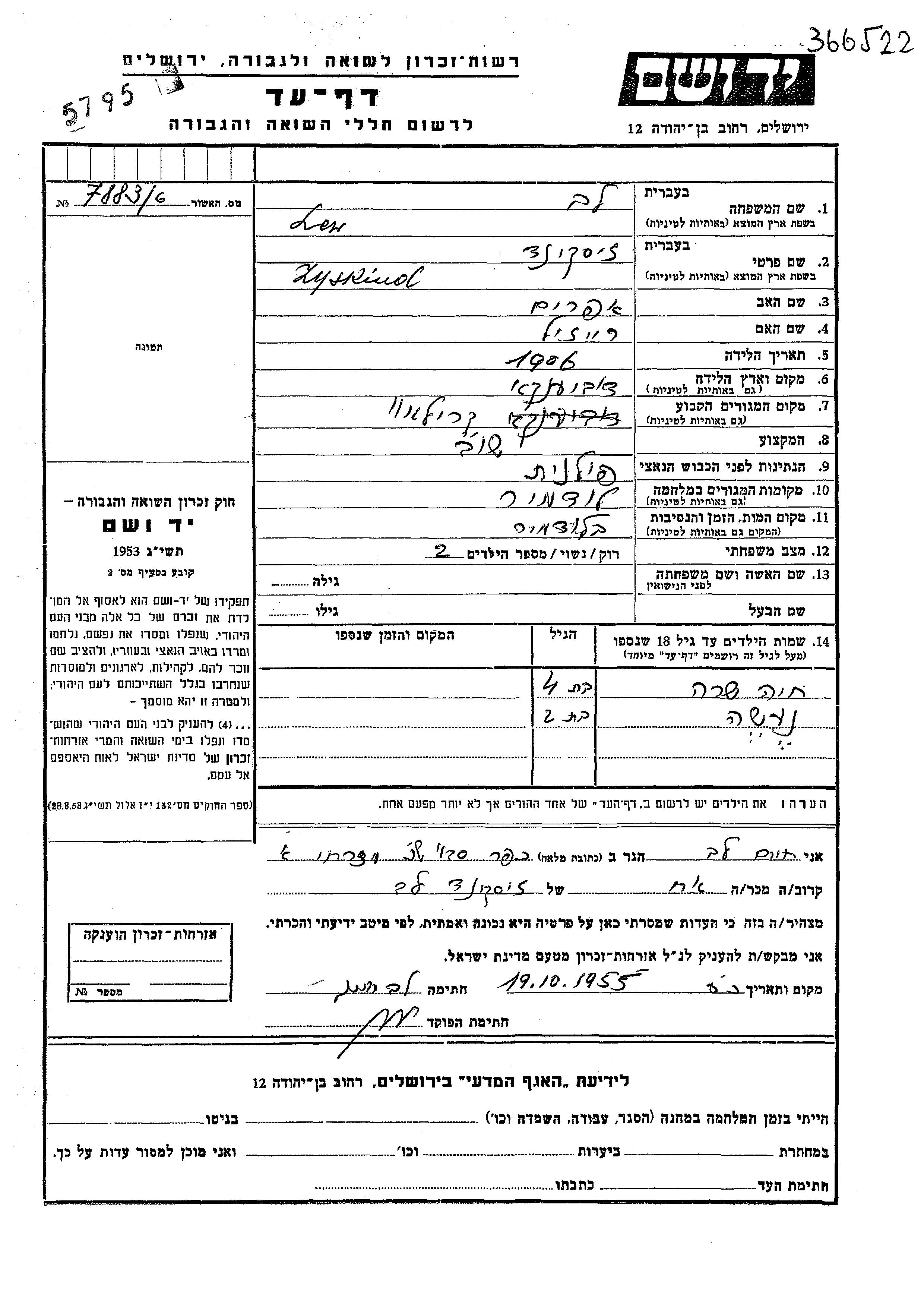 Ziskind Lev wurde im Jahr 1906 in Dubienka, Polen geboren. Er war der Sohn von Efraim und Reizil. Vor dem Zweiten Weltkrieg lebte er in Dubienka, Polen. Während des Krieges war er in Dubienka, Polen.