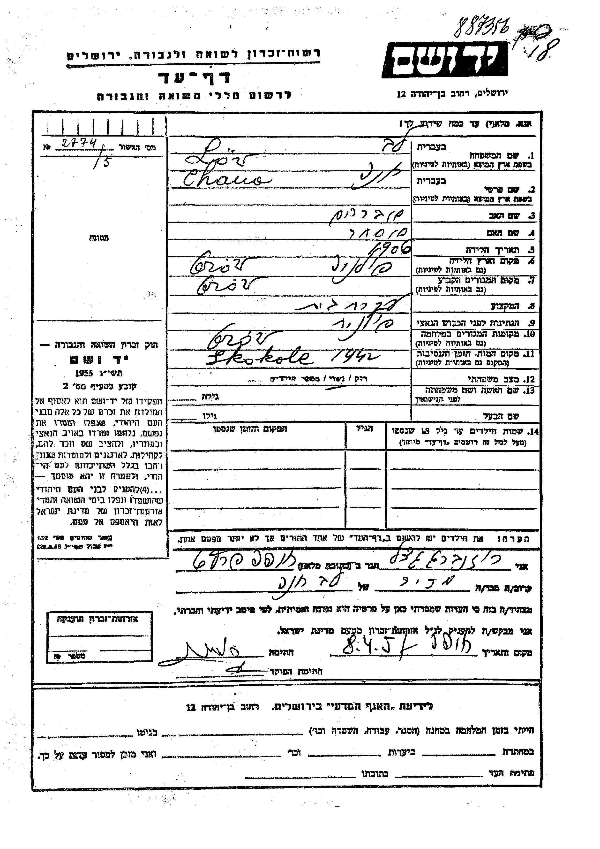 Khana Low wurde im Jahr 1906 in Orow, Polen geboren. Sie war die Tochter von Avraham und Ester. Sie war Hausfrau und Verheiratet. Vor dem Zweiten Weltkrieg lebte sie in Orow, Polen. Während des Krieges war sie in Orow, Polen.