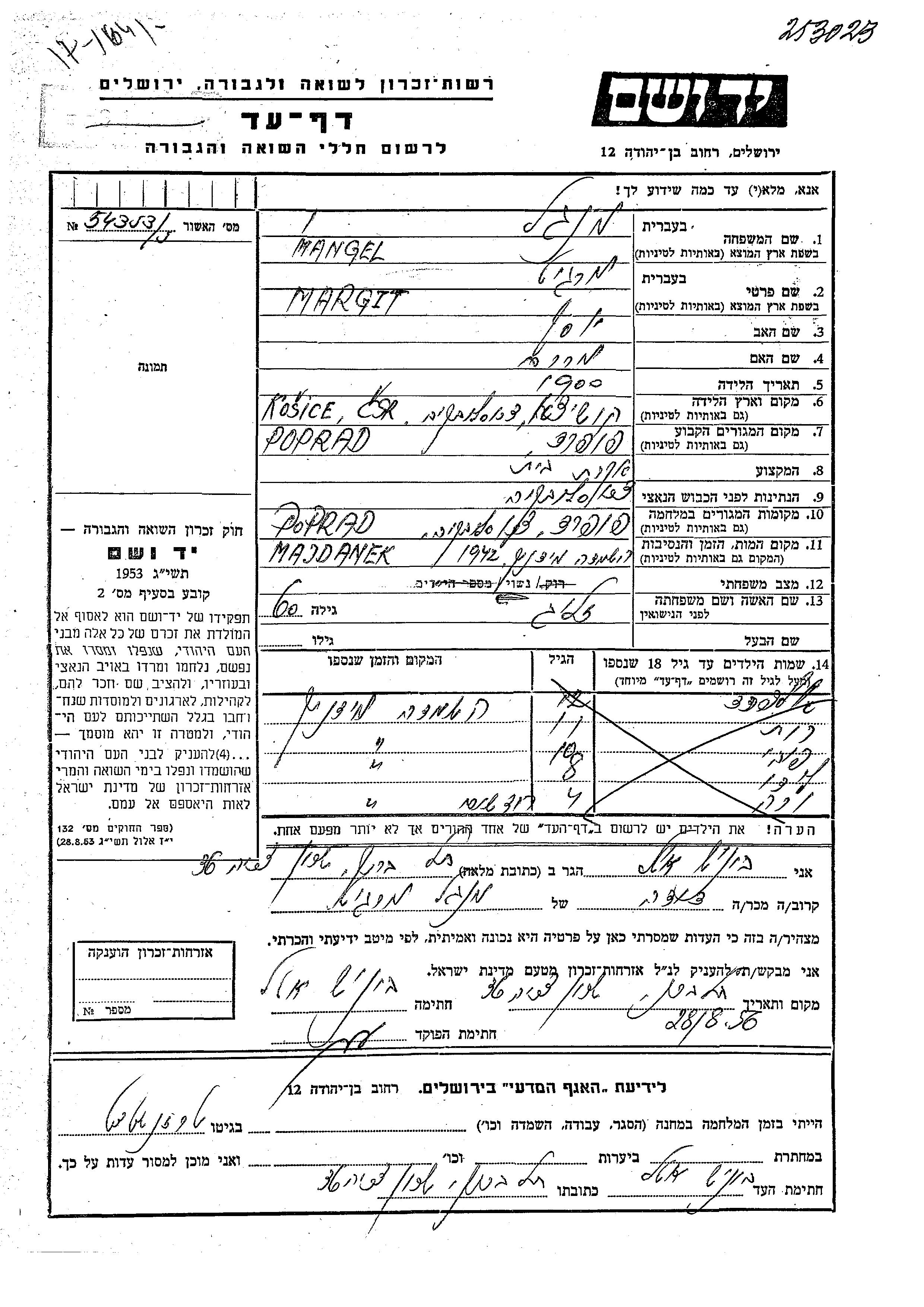 Margit Mangel wurde im Jahr 1900 in Kosice, Tschechoslowakei geboren. Sie war die Tochter von Yosef und Miriam. Sie war Hausfrau und mit Zelig Verheiratet. Vor dem Zweiten Weltkrieg lebte sie in Poprad, Tschechoslowakei. Während des Krieges war sie in Poprad, Tschechoslowakei.