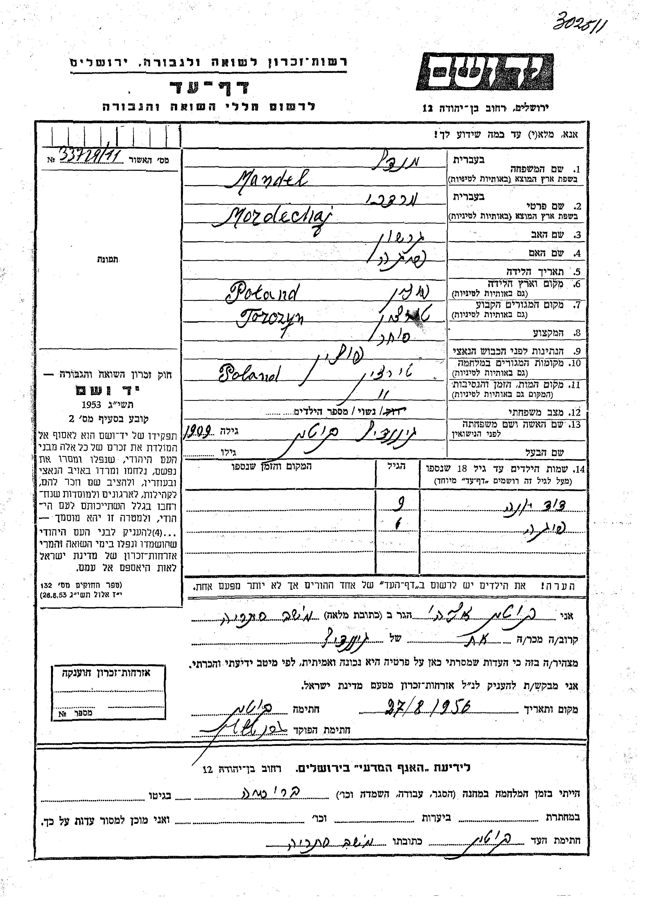 Mordekhai Mandel wurde in Polen geboren. Er war der Sohn von Gershon und Feiga. Er war Kaufmann/-frau und mit Ginendil, geb. Kutin Verheiratet. Vor dem Zweiten Weltkrieg lebte er in Torczyn, Polen. Während des Krieges war er in Torczyn, Polen.