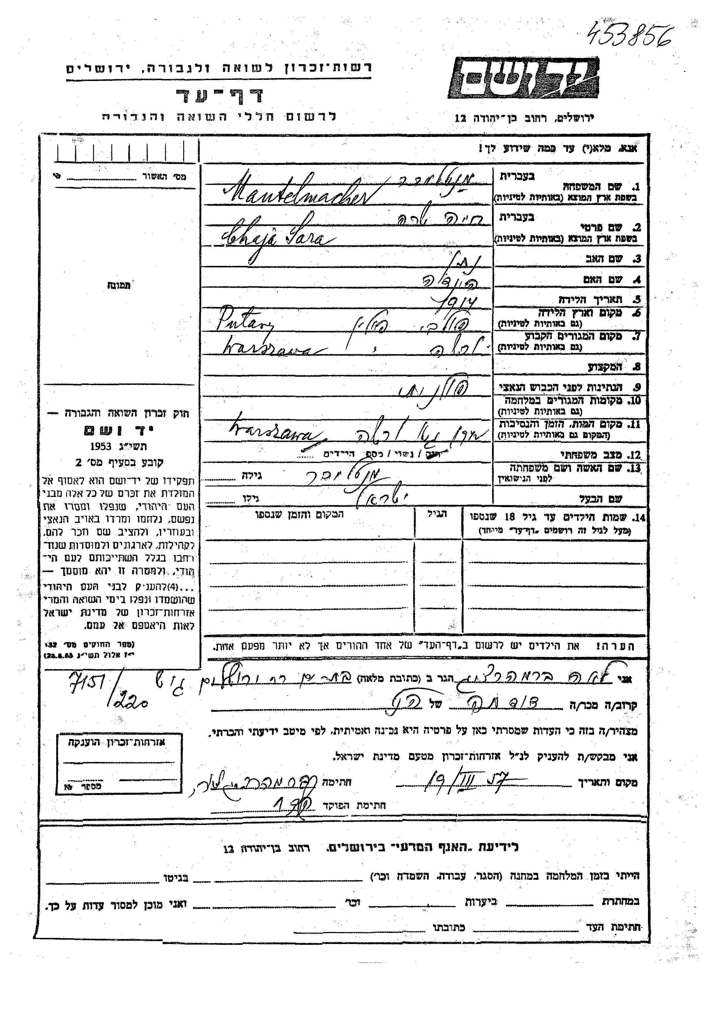 Sara Chaja Mantelmacher wurde im Jahr 1914 in Pulawy, Polen geboren. Sie war die Tochter von Natan und Hinda. Sie war mit Yisrael Verheiratet. Vor dem Zweiten Weltkrieg lebte sie in Warszawa, Polen.