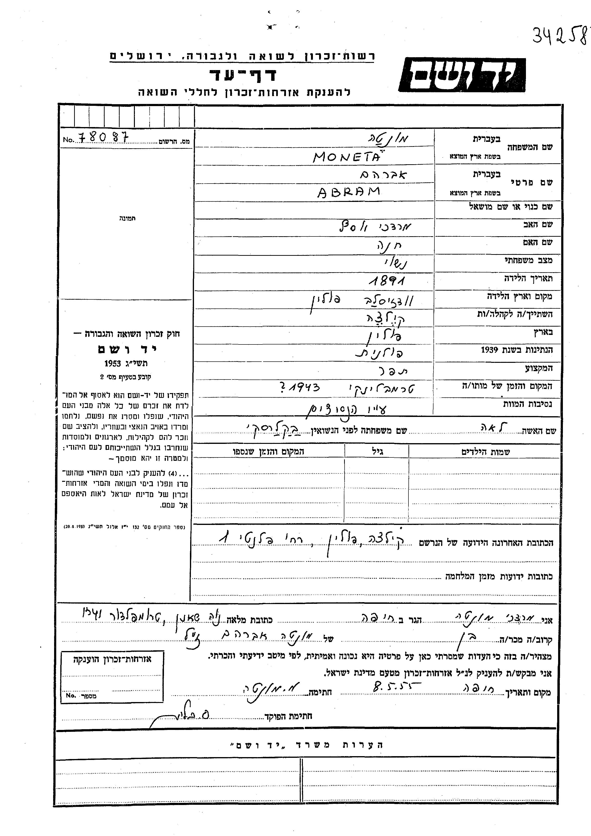 Abram Monte Moneta wurde im Jahr 1891 in Wodzislaw, Polen geboren. Er war der Sohn von Mordekhai Yosef und Khana. Er war Schneider und mit Lea, geb. Baklerski Verheiratet. Vor dem Zweiten Weltkrieg lebte er in Kielce, Polen.