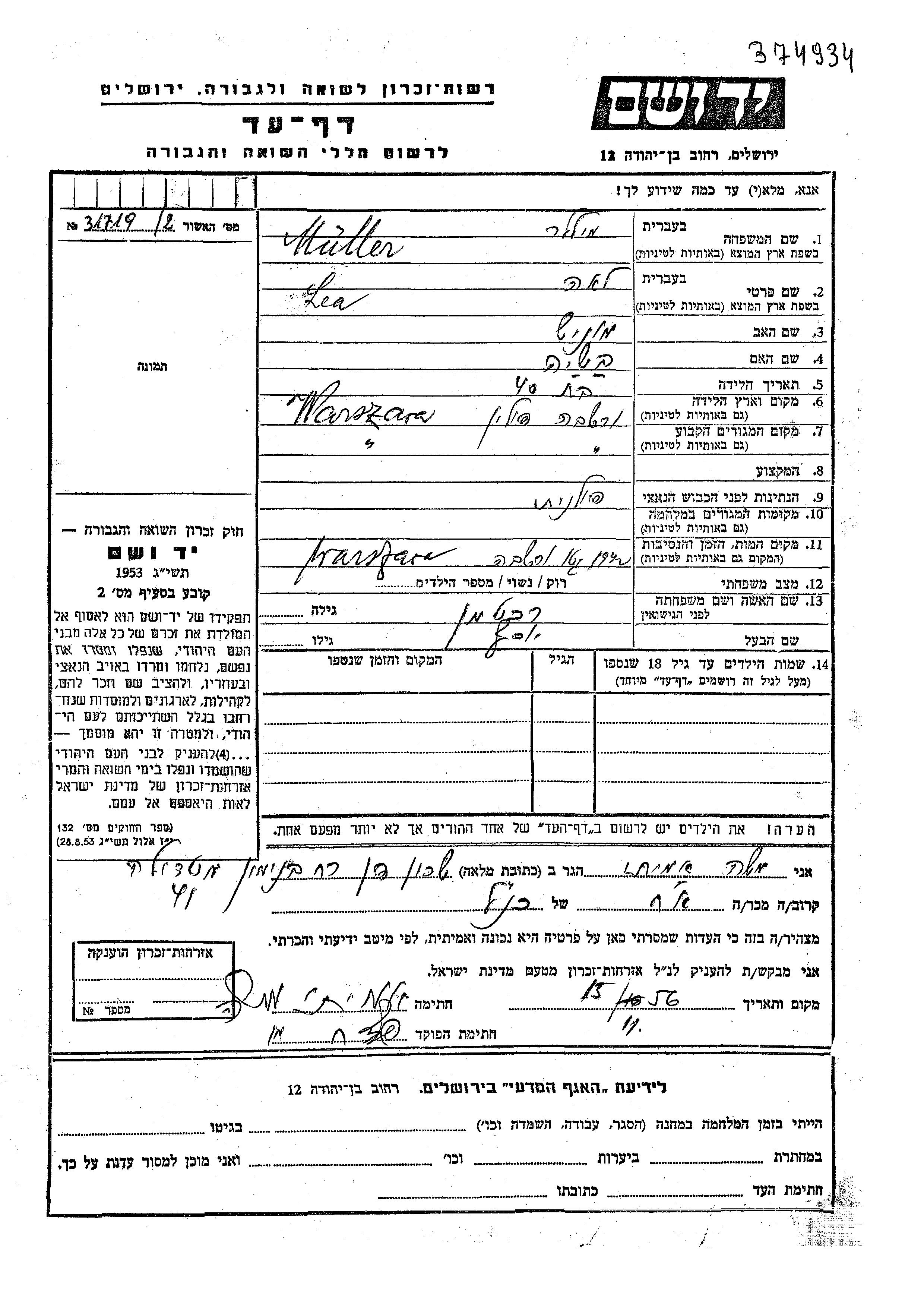 Lea Miler, geb. Rekhtman wurde im Jahr 1902 in Warszawa, Polen geboren. Sie war die Tochter von Munish und Basha. Sie war mit Yosef Verheiratet. Vor dem Zweiten Weltkrieg lebte sie in Warszawa, Polen. Während des Krieges war sie in Warszawa, Polen.