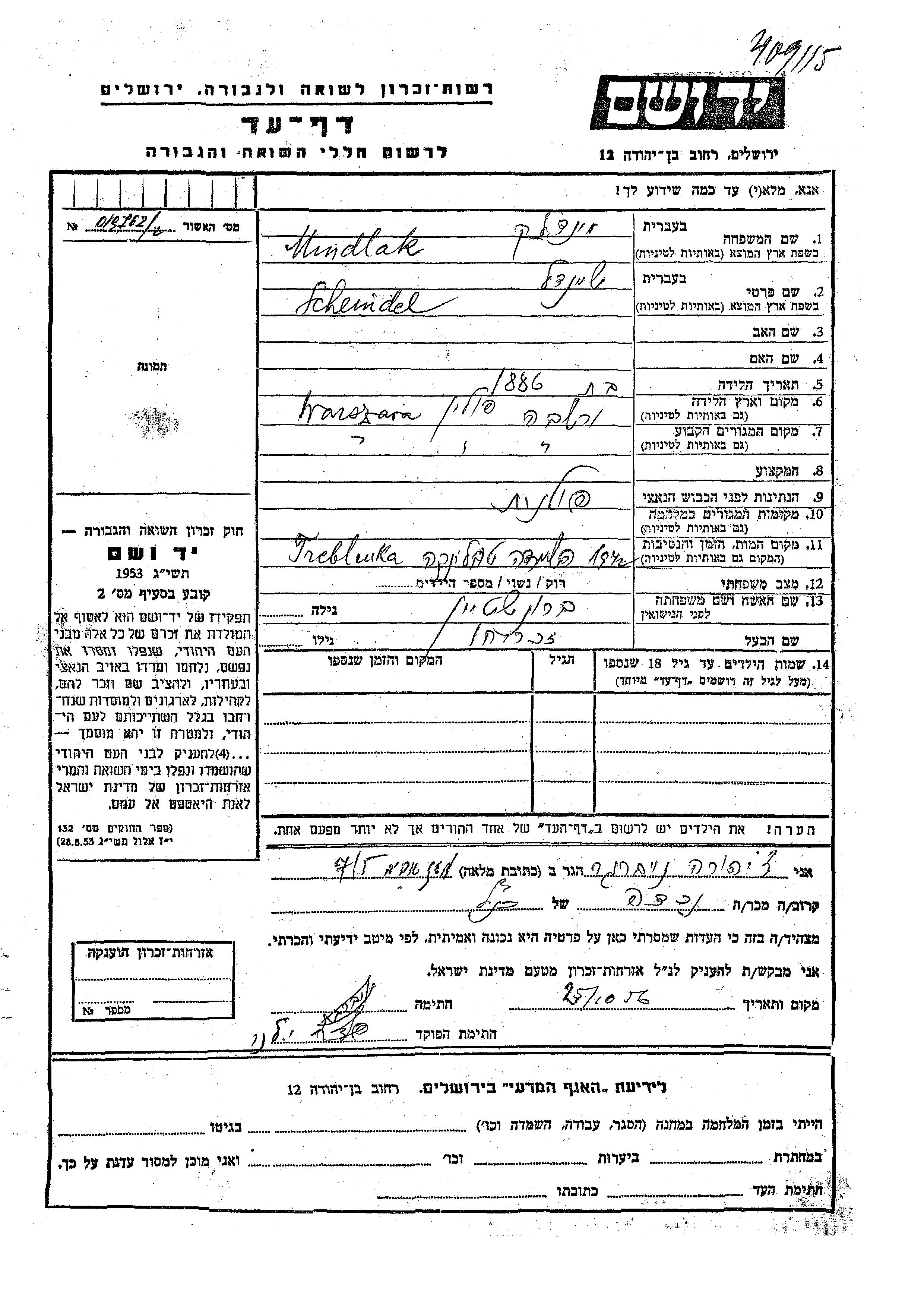 Sheindl Mindlak, geb. Bronshtein wurde im Jahr 1886 in Warszawa, Polen geboren. Sie war mit Zakhariahu Verheiratet. Vor dem Zweiten Weltkrieg lebte sie in Warszawa, Polen.