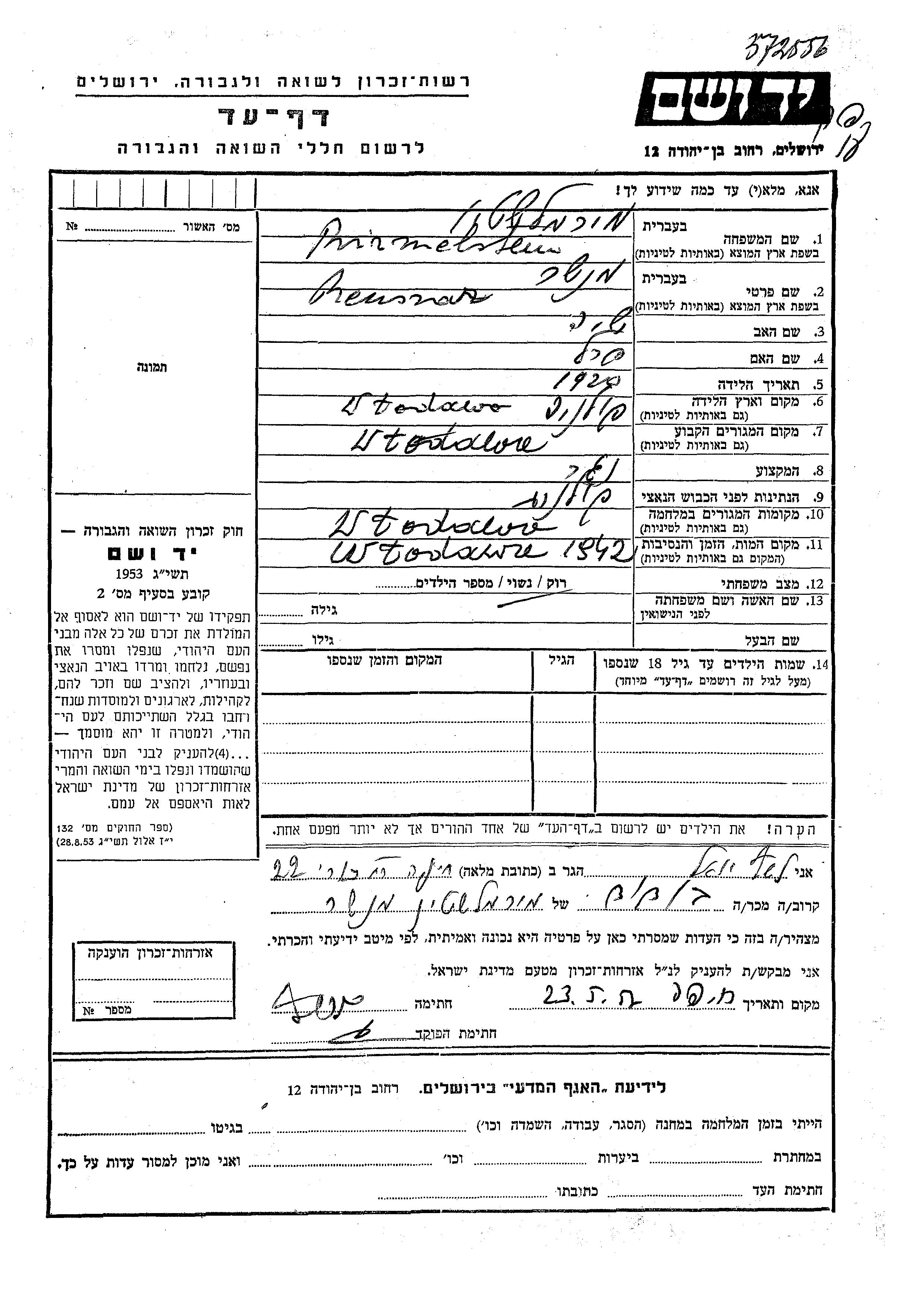 Mensher Mirmelstein wurde im Jahr 1929 in Wlodawa, Polen geboren. Er war der Sohn von Shaia und Perel. Er war Zimmermann. Vor dem Zweiten Weltkrieg lebte er in Wlodawa, Polen. Während des Krieges war er in Wlodawa, Polen.