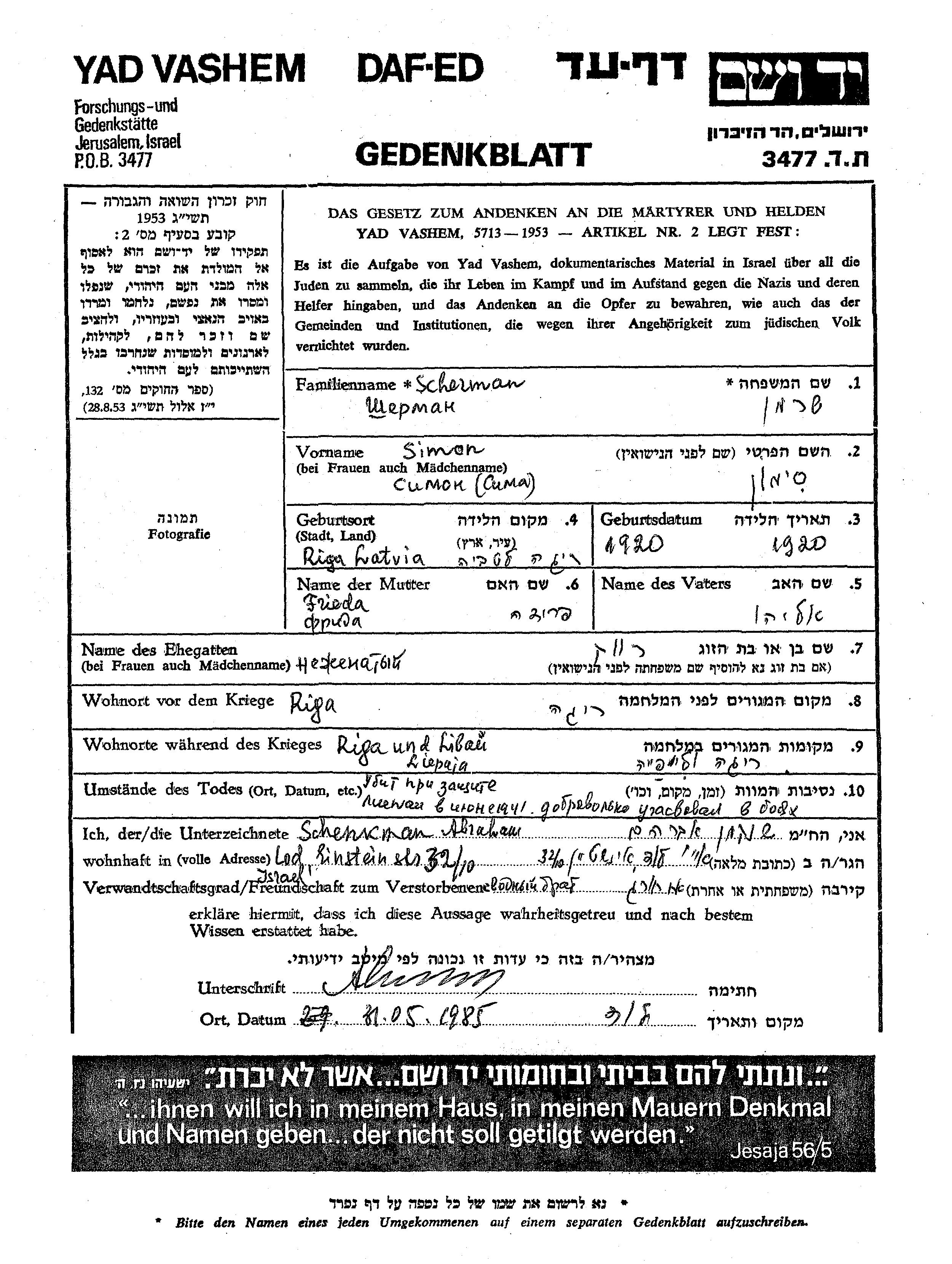 Sima Simon Sherman wurde im Jahr 1920 in Riga, Lettland geboren. Er war der Sohn von Eliahu und Frida. Er war Ledig. Vor dem Zweiten Weltkrieg lebte er in Riga, Lettland. Während des Krieges war er in Libau, Lettland.