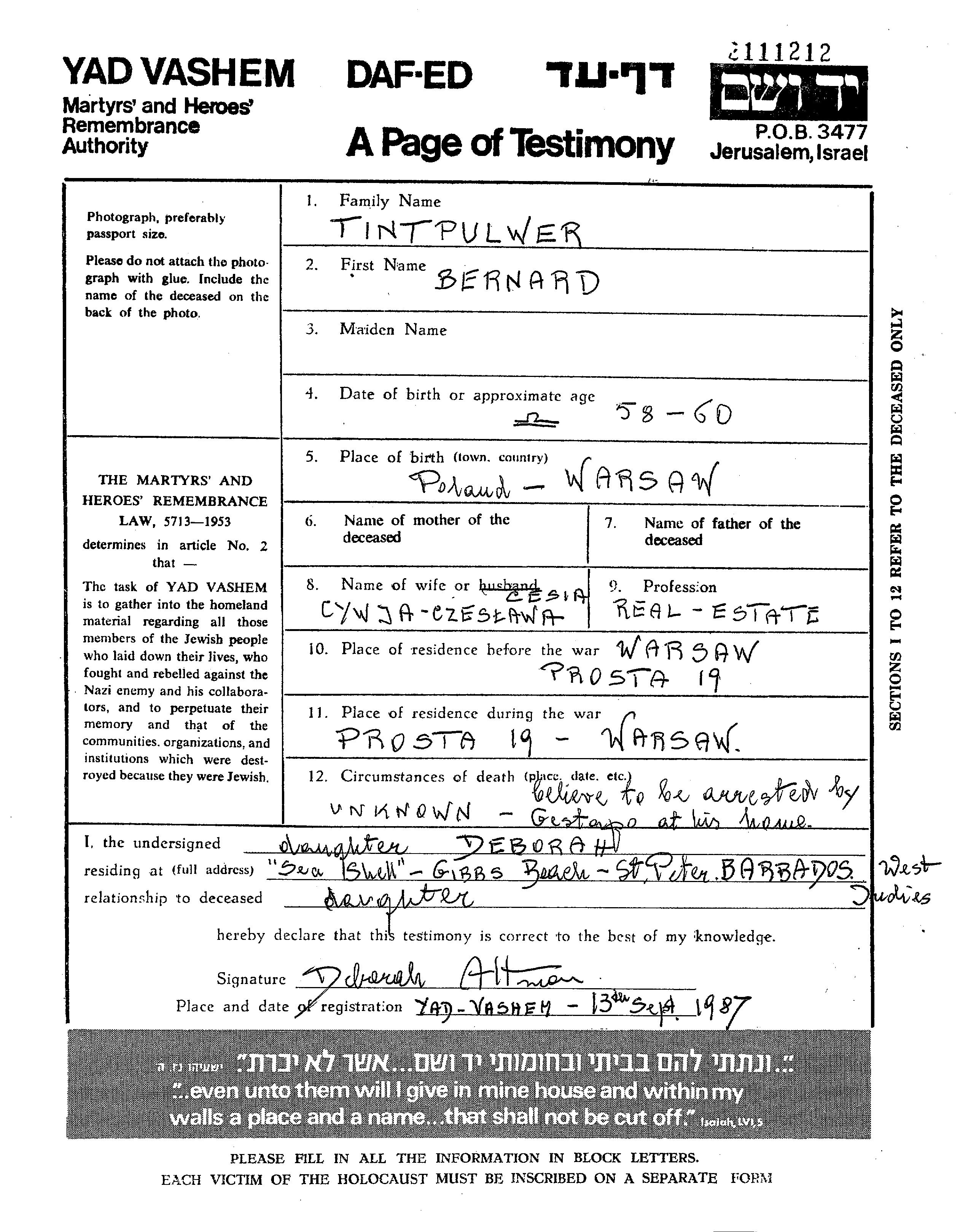 Bernard Tintpulwer wurde in Warszawa, Polen geboren. Er war Angestellte/r in der immobilienbranche und mit Cesia Cywja Verheiratet. Vor dem Zweiten Weltkrieg lebte er in Warszawa, Polen. Während des Krieges war er in Warszawa, Polen.