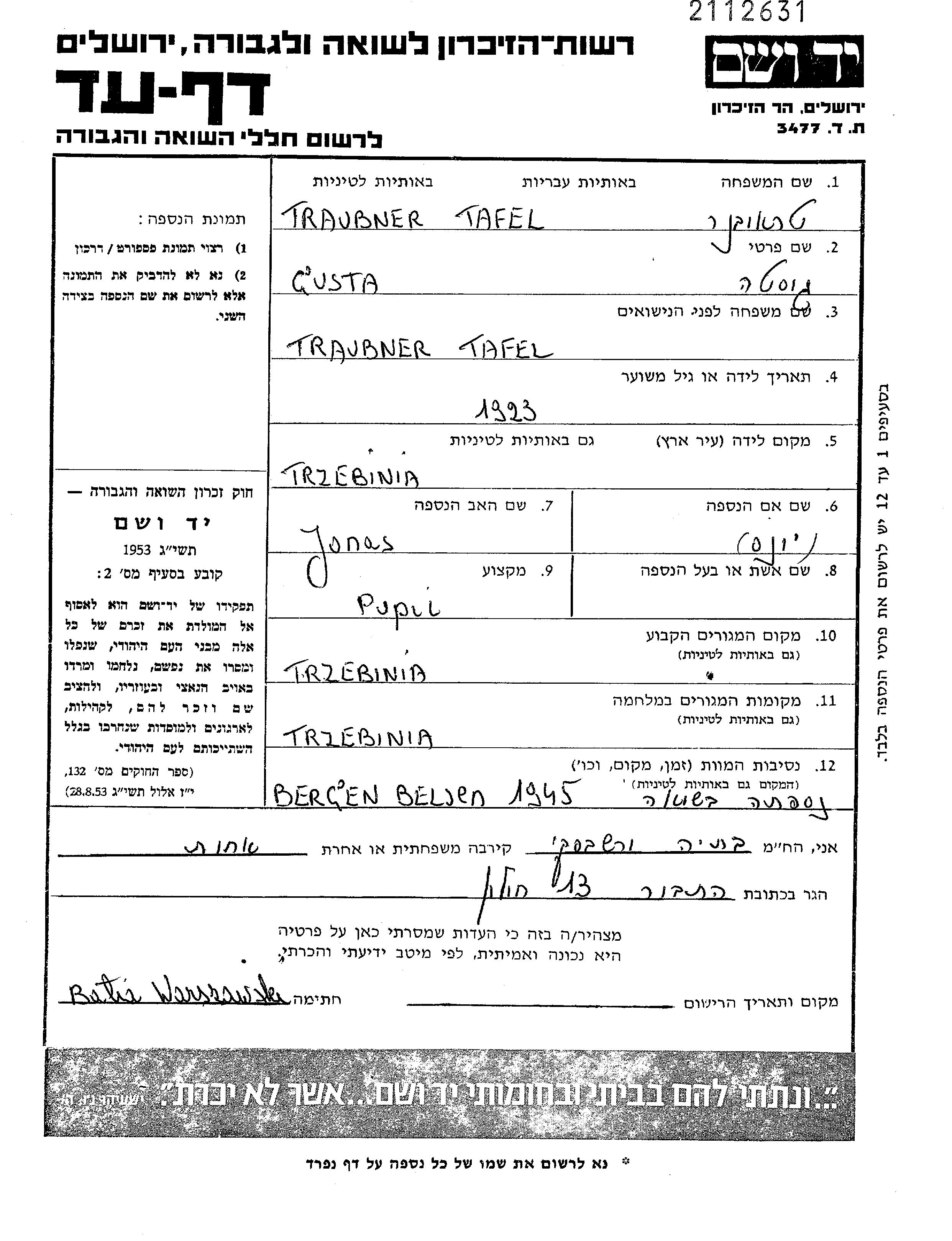 Gusta Traubner, geb. Tafel wurde im Jahr 1923 in Trzebinia, Polen geboren. Sie war die Tochter von Jonas. Sie war Schüler/-in. Vor dem Zweiten Weltkrieg lebte sie in Trzebinia, Polen. Während des Krieges war sie in Trzebinia, Polen.