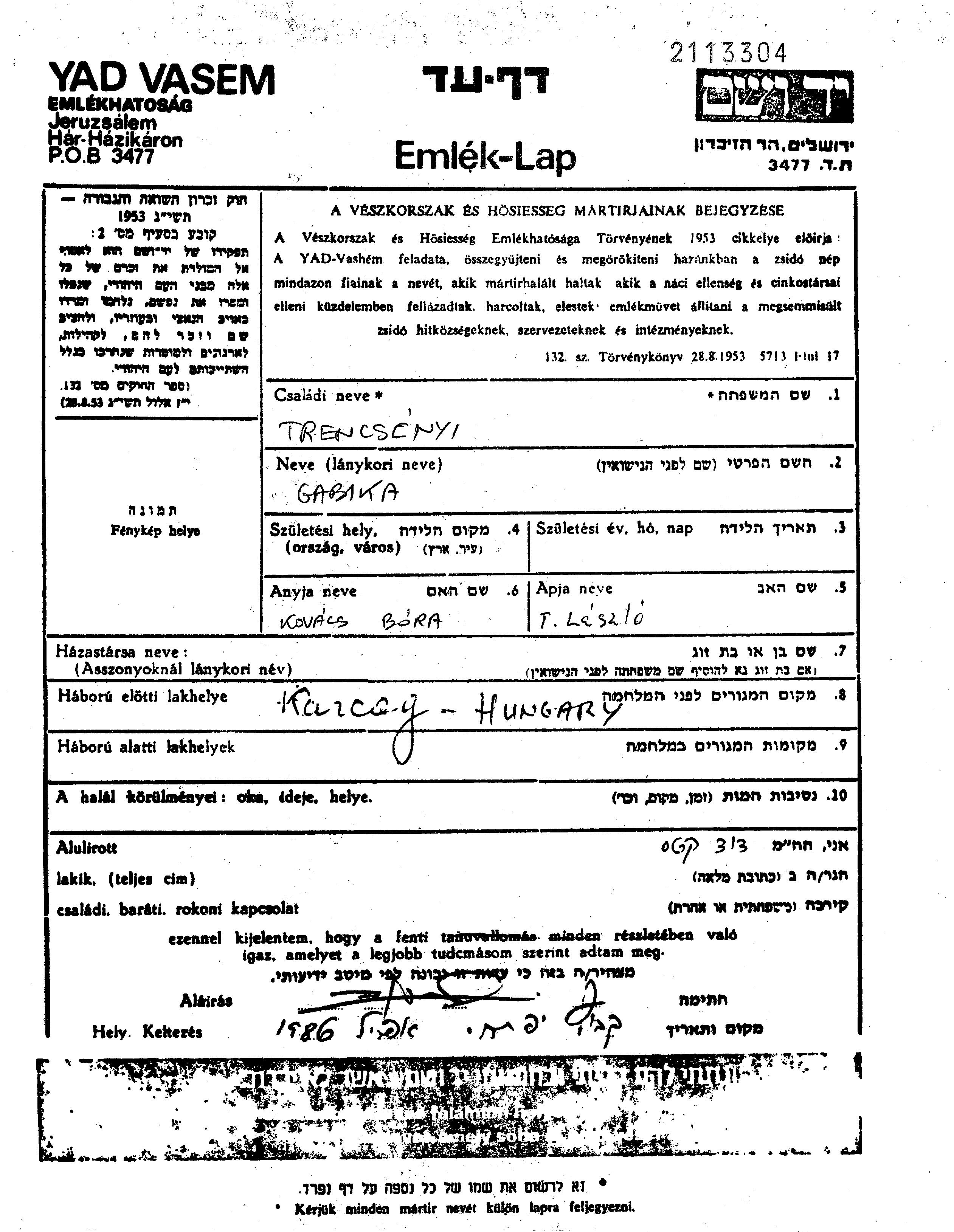 Gabika Trencsenyi wurde Er war der Sohn von Leszlo und Bora, geb. Kovacs. Vor dem Zweiten Weltkrieg lebte er in Karcag, Ungarn.