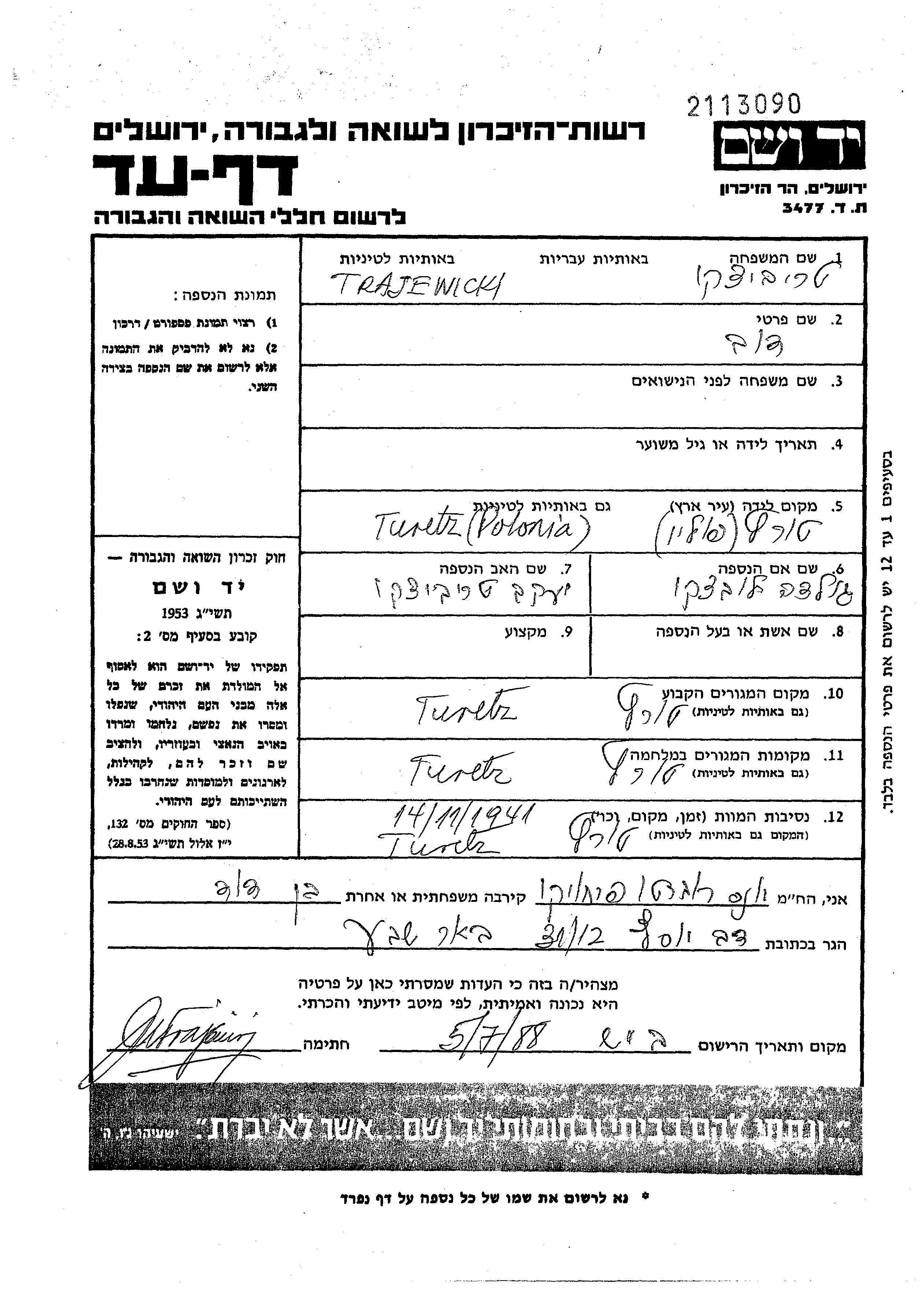 Dov Treievitzki wurde in Turetz, Polen geboren. Vor dem Zweiten Weltkrieg lebte er in Turetz, Polen. Während des Krieges war er in Turetz, Polen.