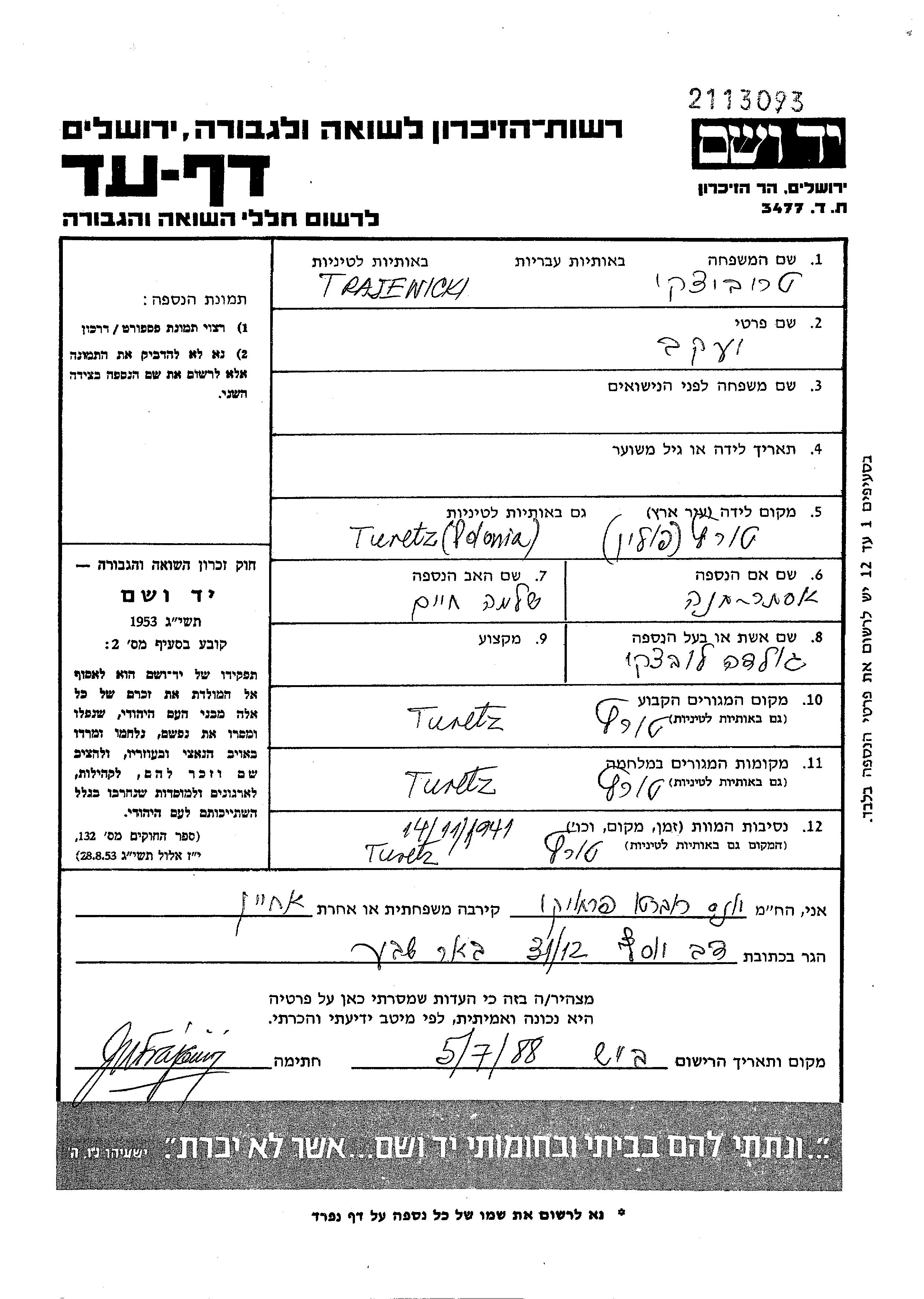 Yaakov wurde in der Schoah ermordet. Todesort: Turetz, Polen im Jahr 14/11/1941.