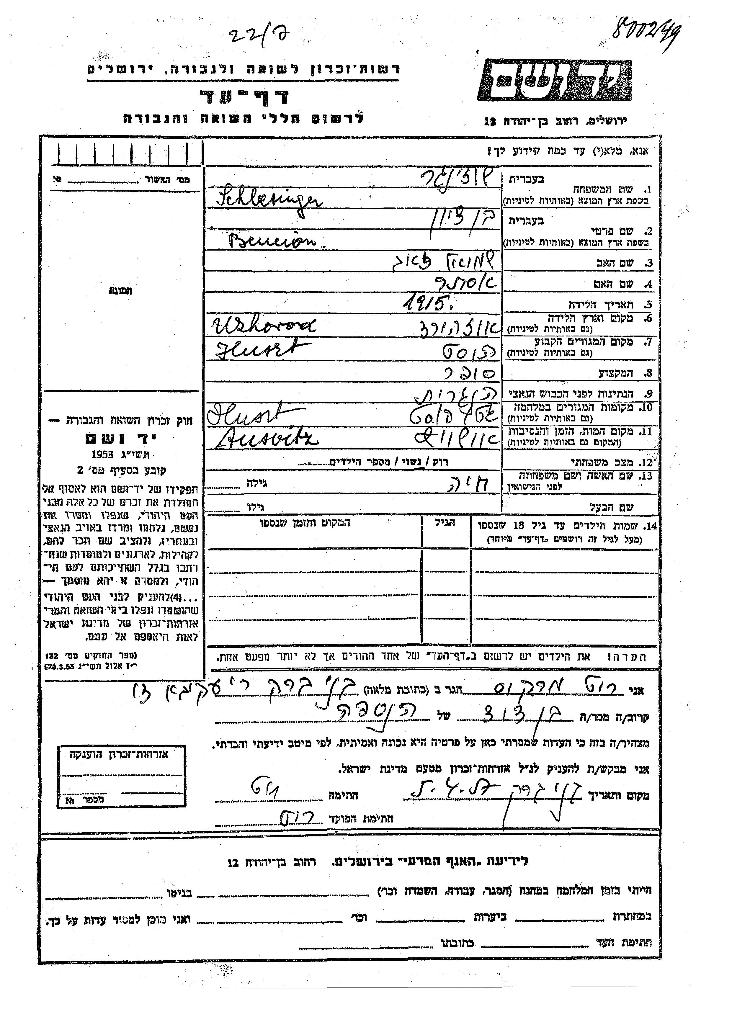 Ben Cion Schlesinger wurde im Jahr 1915 in Uzhorod, Tschechoslowakei geboren. Er war der Sohn von Shmuel Zeev und Ester. Er war Schreiber und mit Khaia Verheiratet. Vor dem Zweiten Weltkrieg lebte er in Huszt, Tschechoslowakei. Während des Krieges war er in Huszt, Tschechoslowakei.