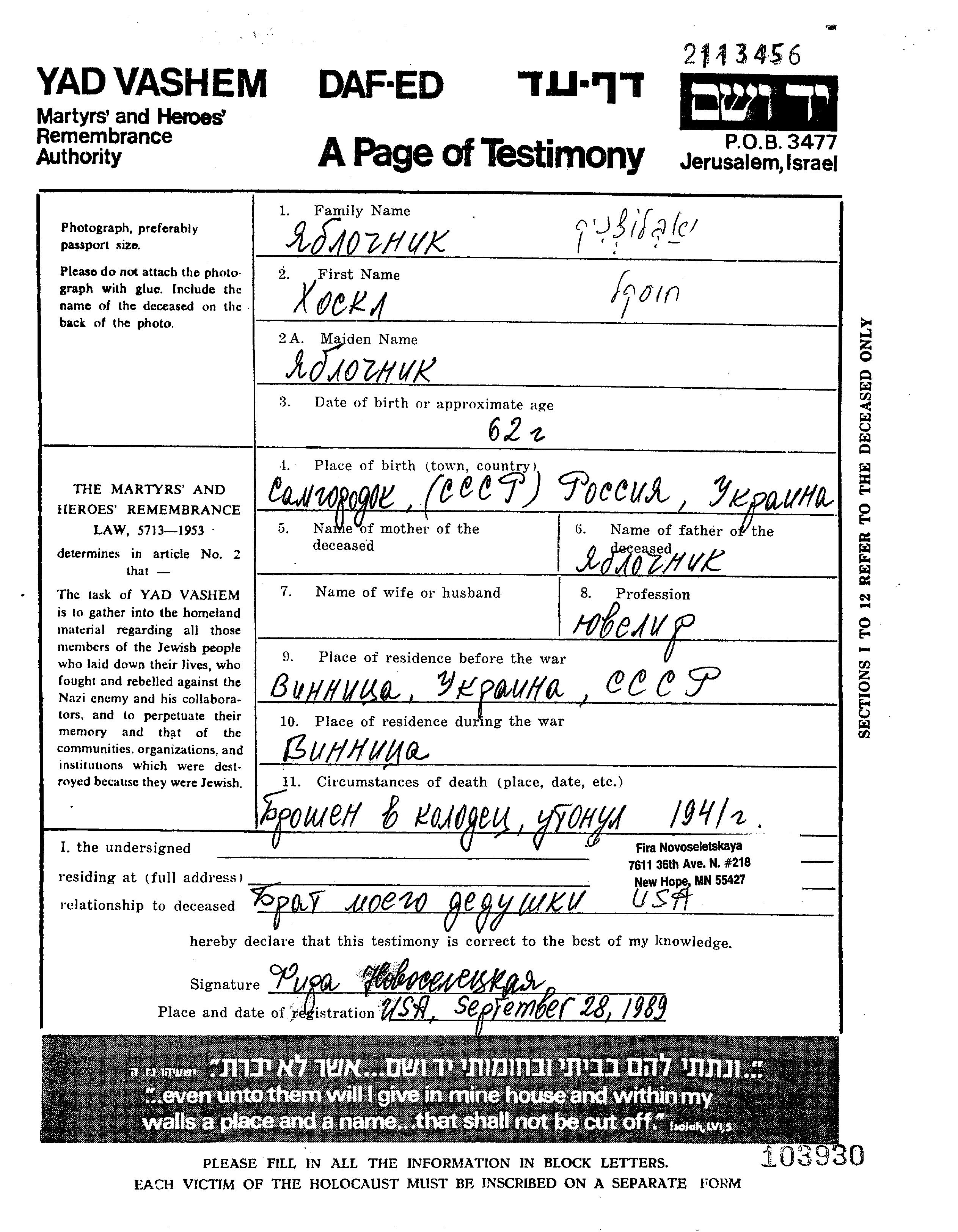 Khoskl Yablochnik wurde im Jahr 1879 in Samgorodok, Ukraine (UdSSR) geboren. Er war Juwelier. Vor dem Zweiten Weltkrieg lebte er in Vinitza, Ukraine (UdSSR). Während des Krieges war er in Vinitza, Ukraine (UdSSR).