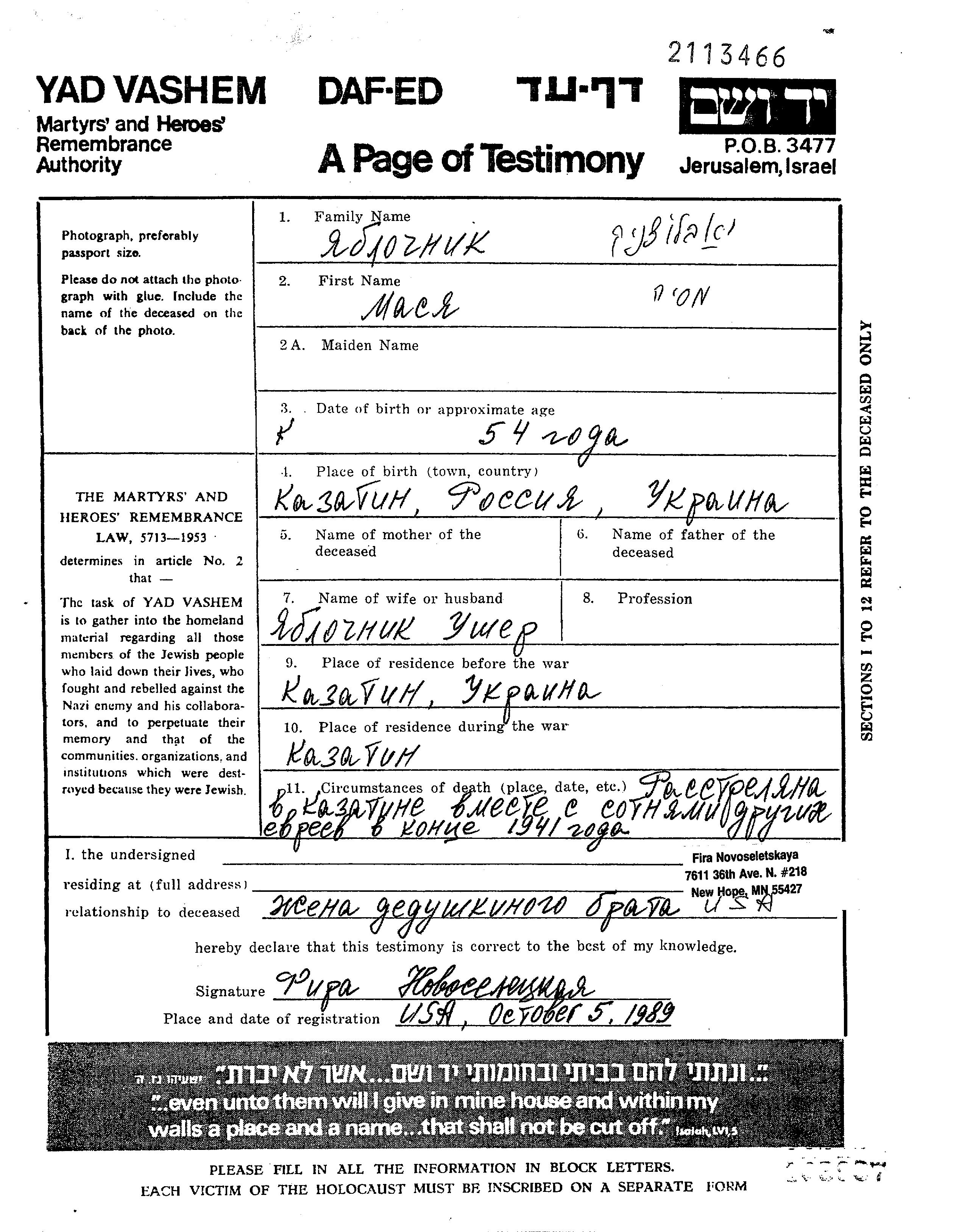 Masya wurde in der Schoah ermordet. Todesort: Kazatin, Ukraine (UdSSR) im Jahr 1941.