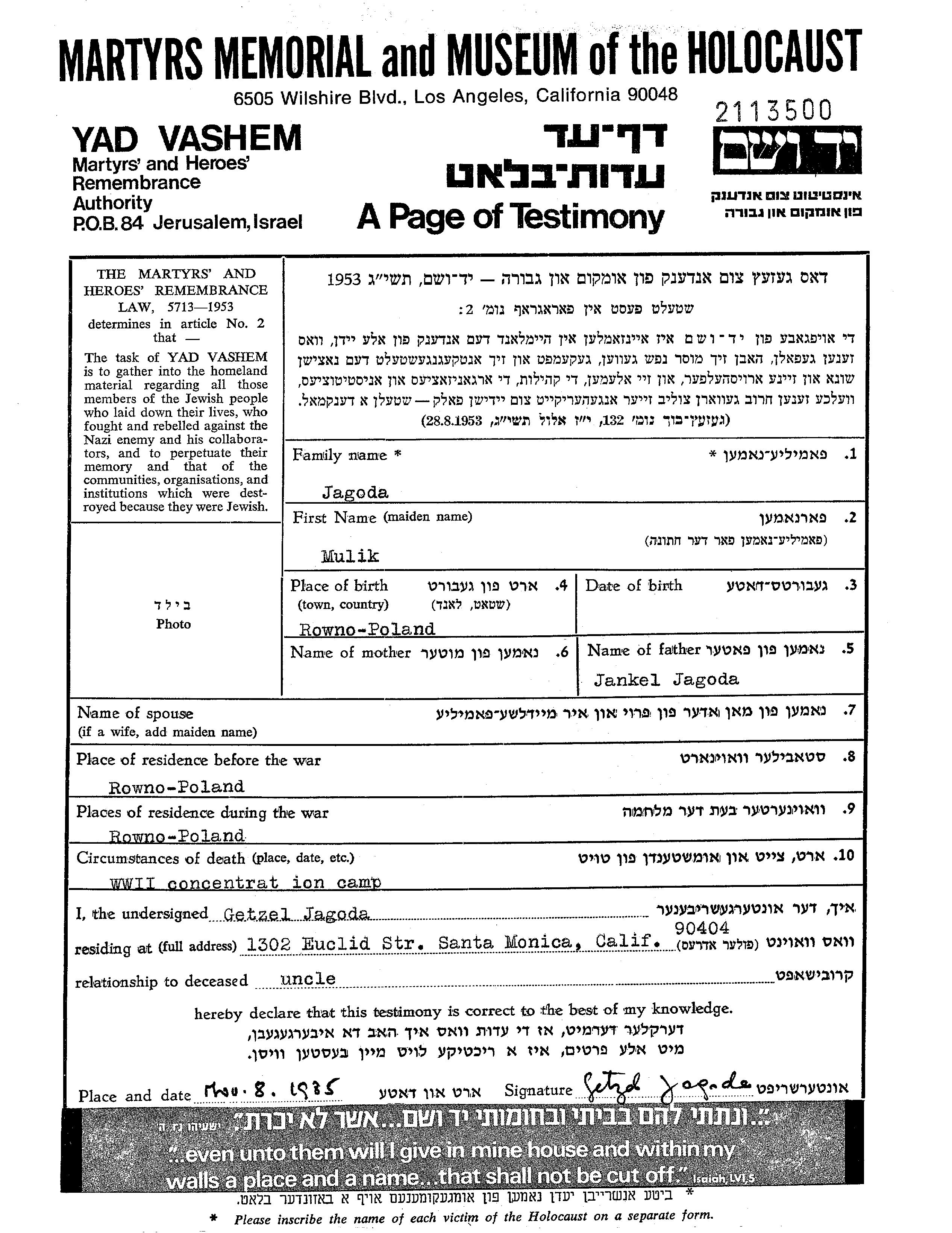 Mulik Jagoda wurde in Rowno, Polen geboren. Er war der Sohn von Jankel. Vor dem Zweiten Weltkrieg lebte er in Rowno, Polen. Während des Krieges war er in Rowno, Polen.