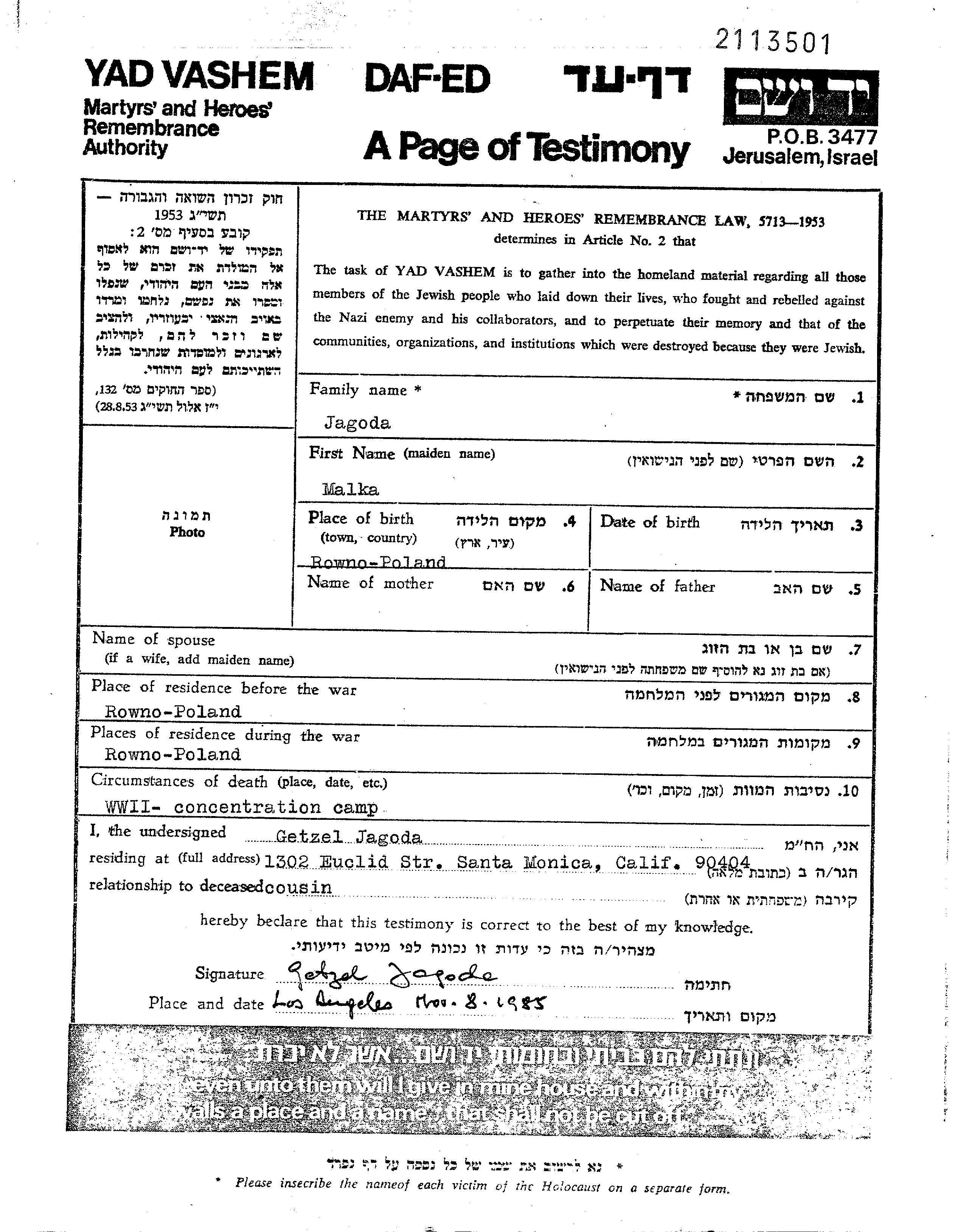 Malka Jagoda wurde in Rowno, Polen geboren. Vor dem Zweiten Weltkrieg lebte sie in Rowno, Polen. Während des Krieges war sie in Rowno, Polen.