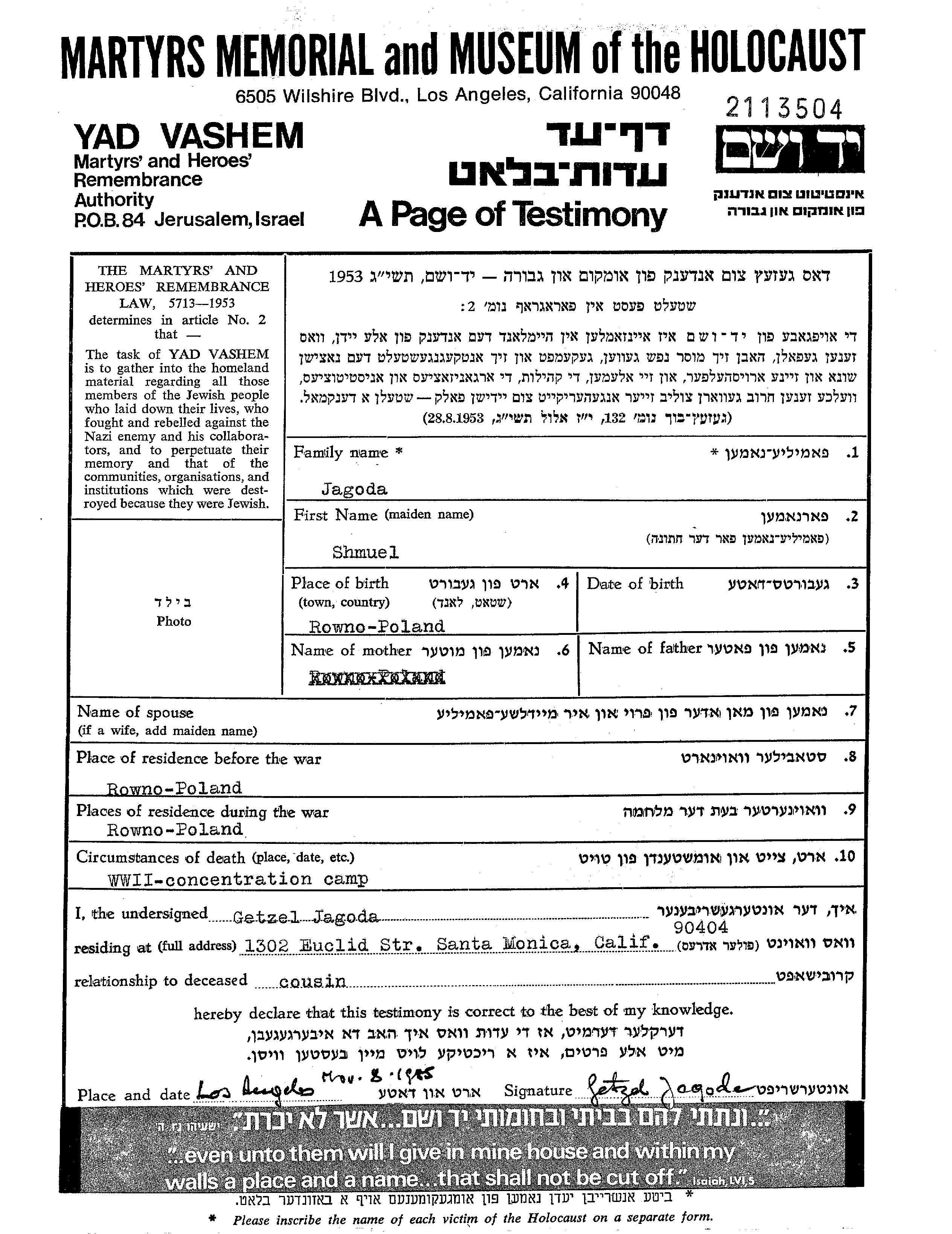 Shmuel Jagoda wurde in Rowno, Polen geboren. Vor dem Zweiten Weltkrieg lebte er in Rowno, Polen. Während des Krieges war er in Rowno, Polen.