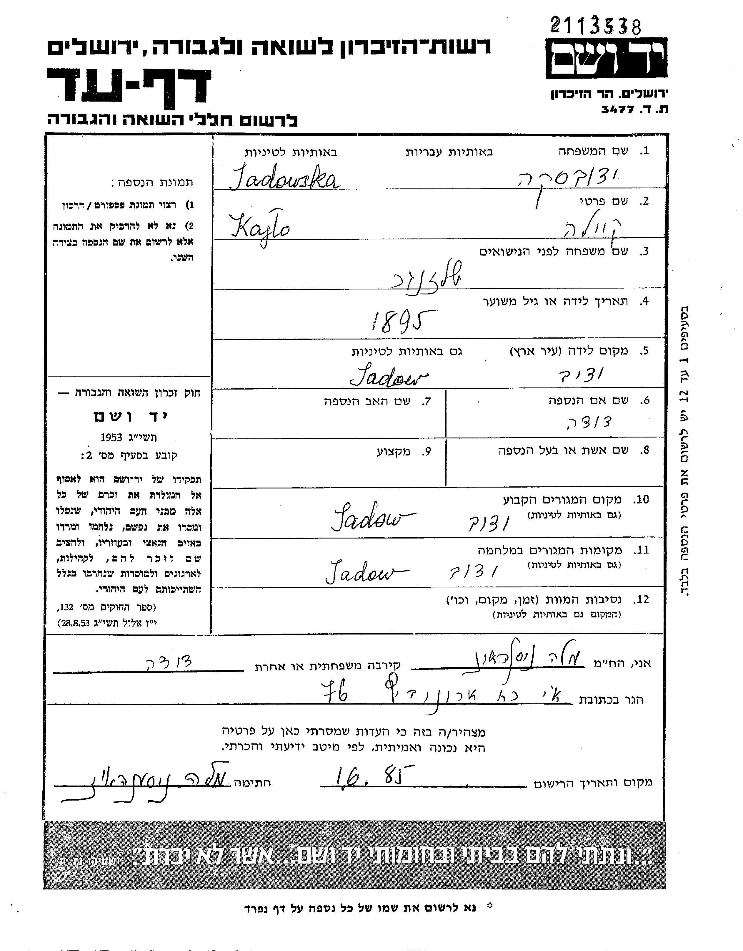 Kajlo Jadowska, geb. Shlezinger wurde im Jahr 1895 in Jadow, Polen geboren. Sie war die Tochter von Doda. Sie war Verheiratet. Vor dem Zweiten Weltkrieg lebte sie in Jadow, Polen. Während des Krieges war sie in Jadow, Polen.