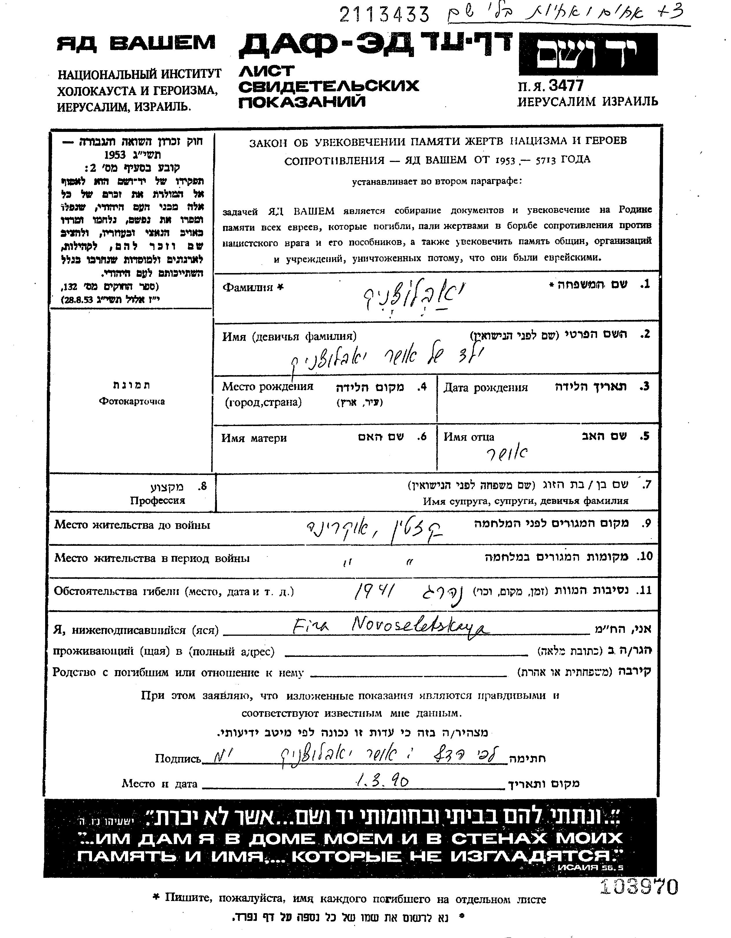 Vorname unbekannt Iablochnik wurde Er war der Sohn von Usher. Er war Kind. Vor dem Zweiten Weltkrieg lebte er in Kazatin, Ukraine (UdSSR). Während des Krieges war er in Kazatin, Ukraine (UdSSR).