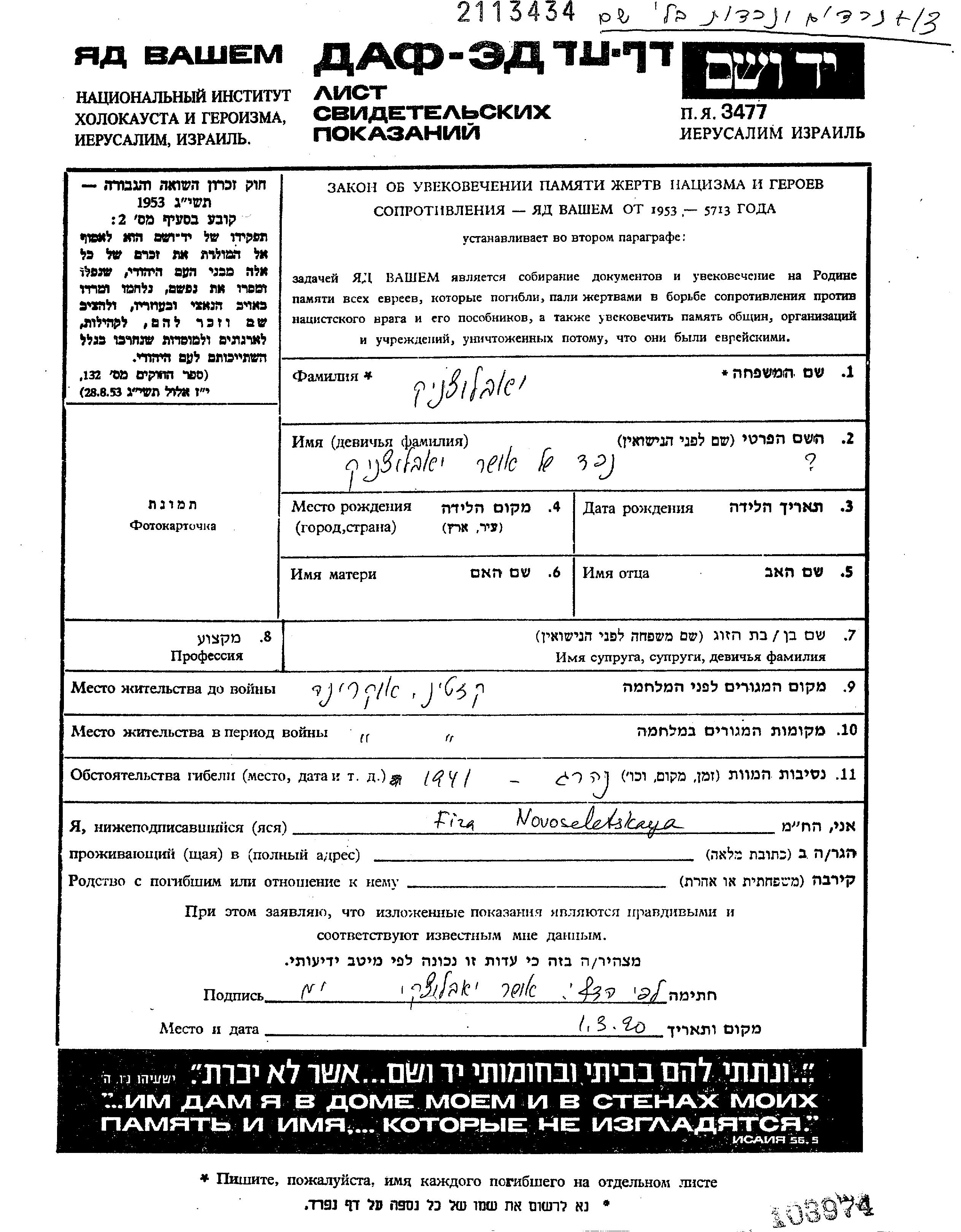 Vorname unbekannt Iablonka. Vor dem Zweiten Weltkrieg lebte er in Kazatin, Ukraine (UdSSR). Während des Krieges war er in Kazatin, Ukraine (UdSSR).