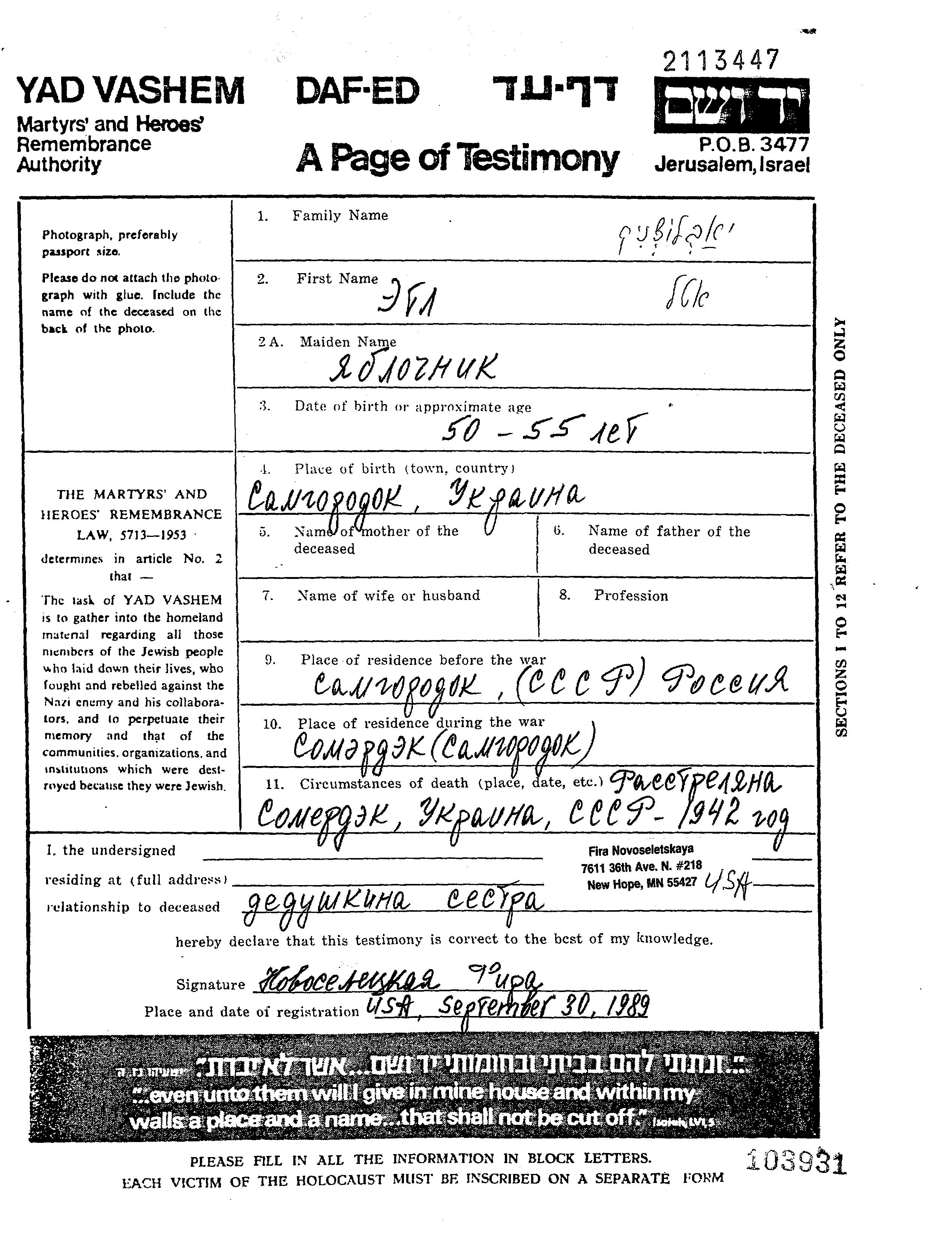 Etl Iablochnik wurde in Samgorodok, Ukraine (UdSSR) geboren. Vor dem Zweiten Weltkrieg lebte sie in Samgorodok, Ukraine (UdSSR). Während des Krieges war sie in Samgorodok, Ukraine (UdSSR).