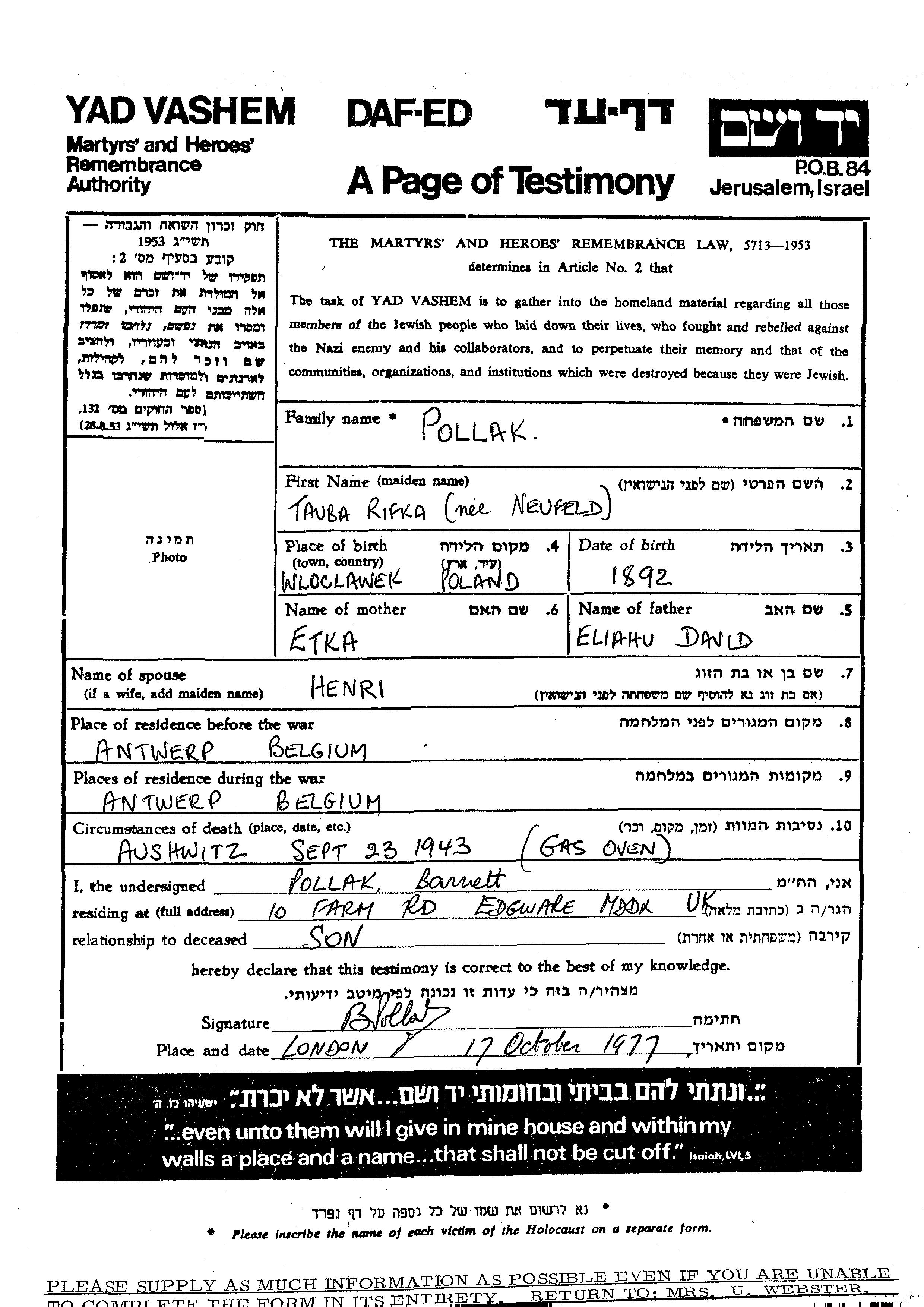 Rivka Tauba Pollak, geb. Neufeld wurde im Jahr 1892 in Wloclawek, Polen geboren. Sie war die Tochter von Eliahu David und Etka. Vor dem Zweiten Weltkrieg lebte sie in Antwerpen, Belgien. Während des Krieges war sie in Antwerpen, Belgien.