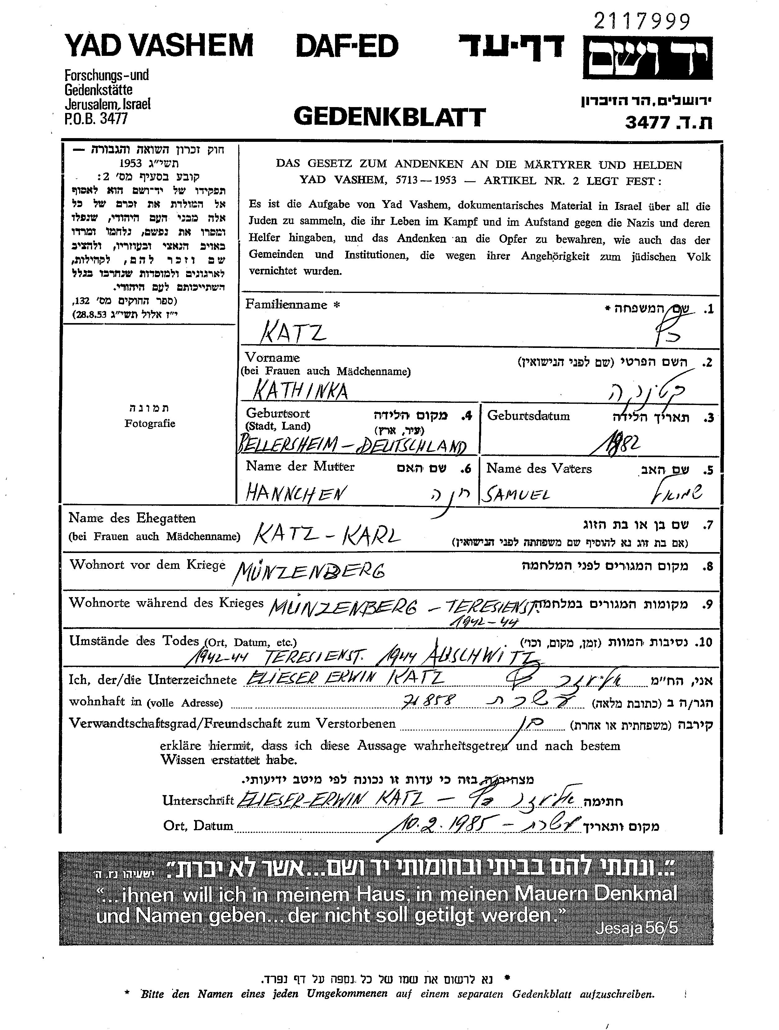 Katerina Katz wurde im Jahr 1882 in Bellersheim, Deutsches Reich geboren. Sie war die Tochter von Samuel und Hannchen. Sie war mit Karl Verheiratet. Vor dem Zweiten Weltkrieg lebte sie in Muenzenberg, Deutsches Reich. Während des Krieges war sie in Theresienstadt, Tschechoslowakei.