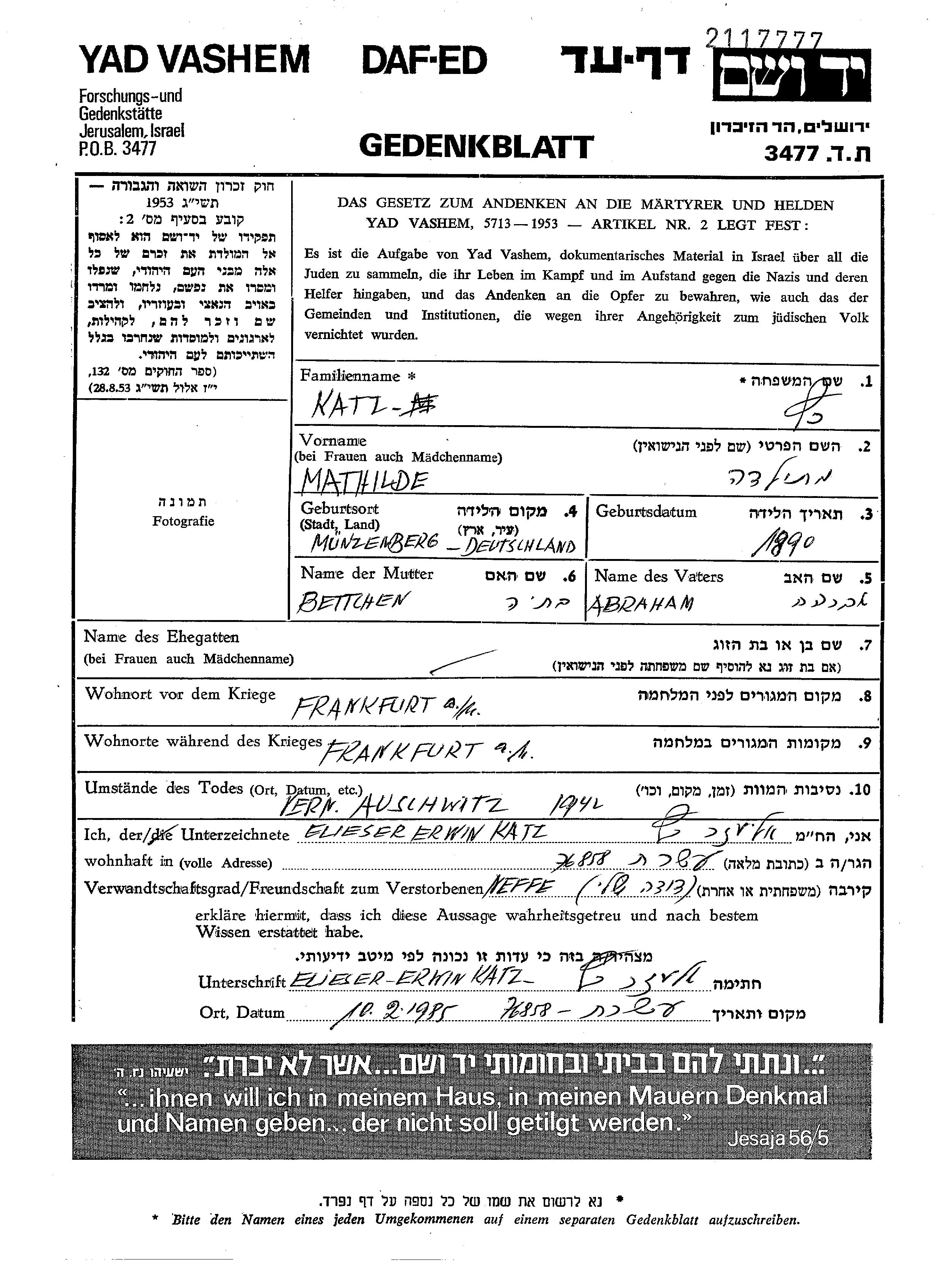 Matilda Katz wurde im Jahr 1890 in Muenzenberg, Deutsches Reich geboren. Sie war die Tochter von Avraham und Bettchen Batia. Vor dem Zweiten Weltkrieg lebte sie in Frankfurt am Main, Deutsches Reich. Während des Krieges war sie in Frankfurt am Main, Deutsches Reich.