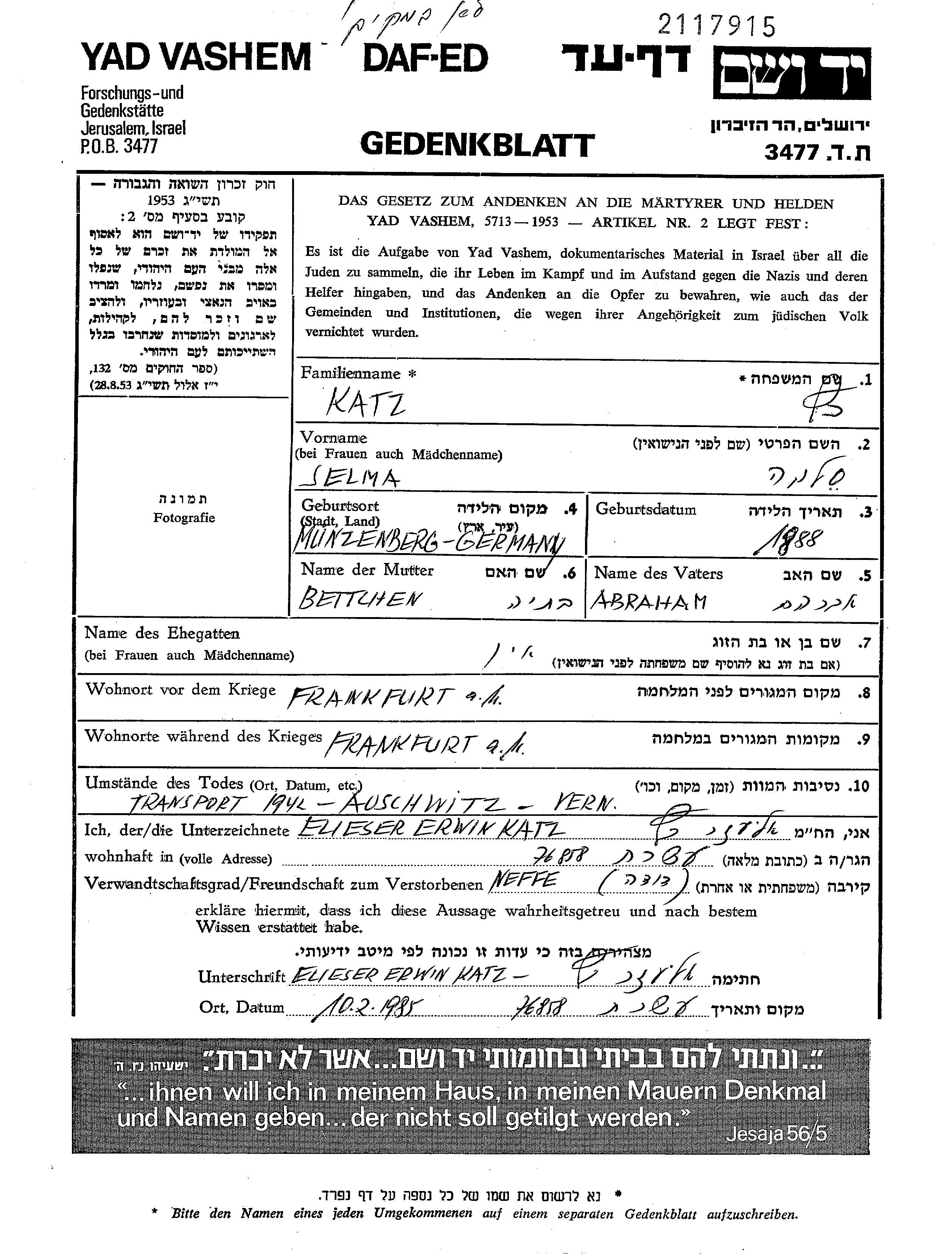Selma Katz wurde im Jahr 1888 in Muenzenberg, Deutsches Reich geboren. Sie war die Tochter von Abraham und Batia Bettchen. Vor dem Zweiten Weltkrieg lebte sie in Frankfurt am Main, Deutsches Reich. Während des Krieges war sie in Frankfurt am Main, Deutsches Reich.