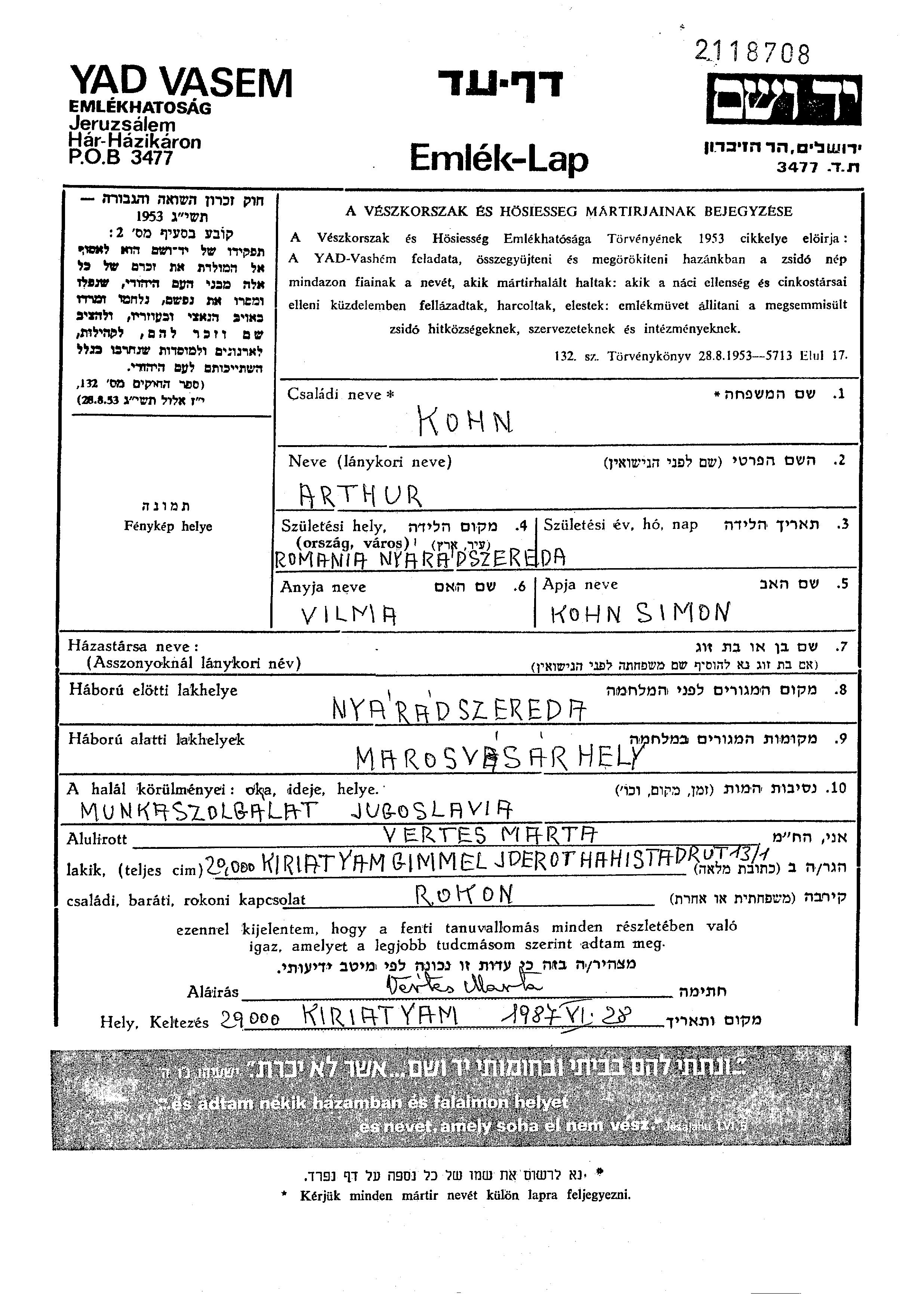 Kohn Arthur Nyaradszereda, Rumänien Gedenkblatt