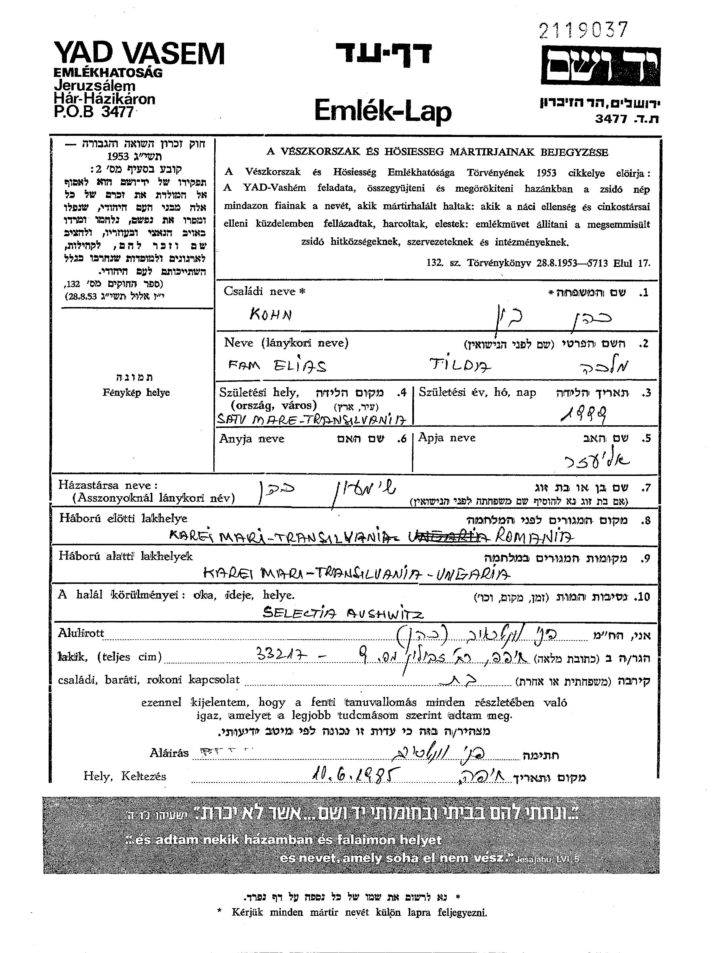 Tilda Malka Kun Kohen, geb. Elias wurde im Jahr 1899 in Satu Mare, Rumänien geboren. Sie war die Tochter von Eliezer. Sie war mit Shimon Verheiratet. Vor dem Zweiten Weltkrieg lebte sie in Karei, Rumänien. Während des Krieges war sie in Karei, Rumänien.
