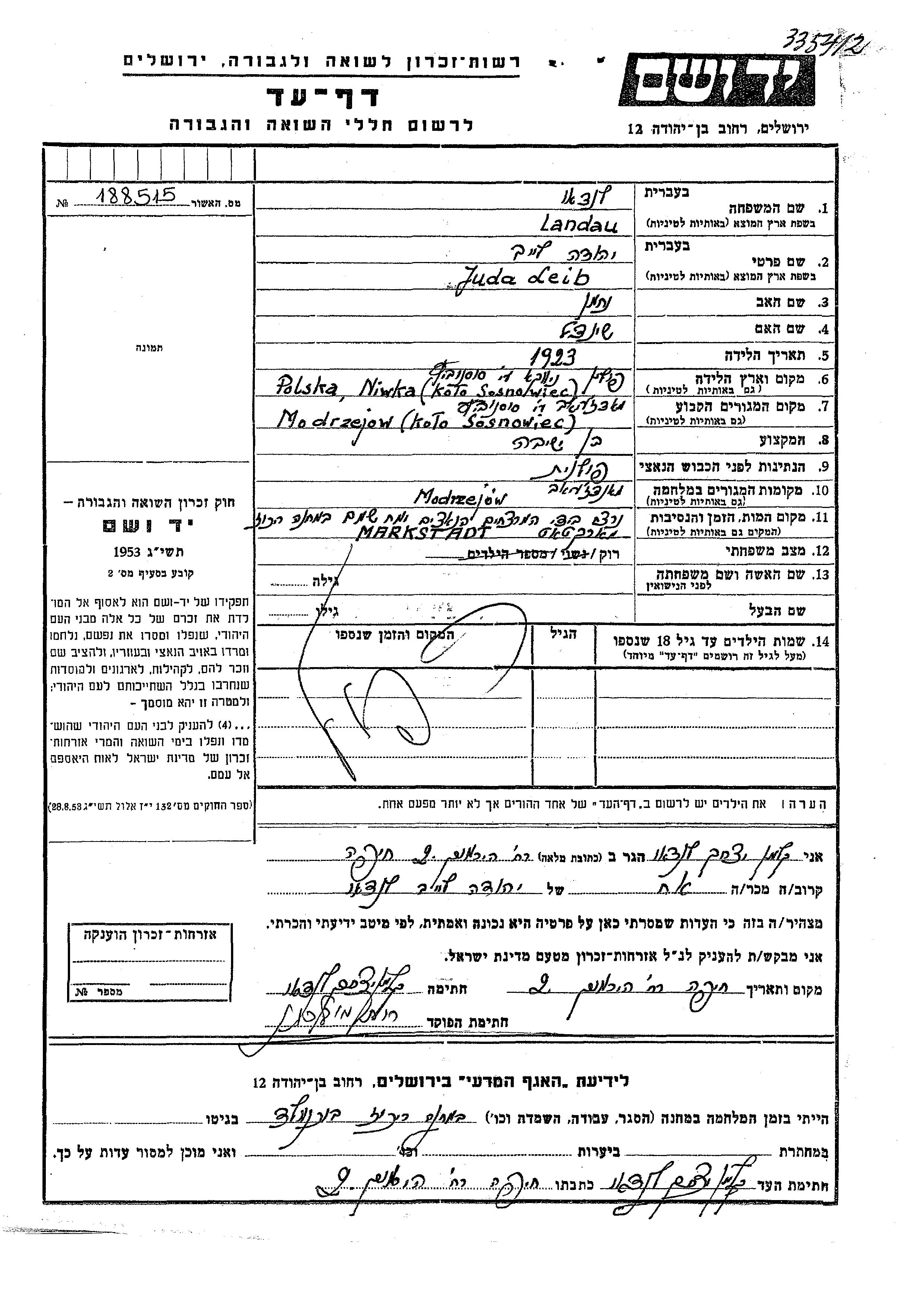 Juda Leib Landau wurde im Jahr 1923 in Niwka, Polen geboren. Er war der Sohn von Nakhman und Sheindl. Er war Jeschiwahschüler und Ledig. Vor dem Zweiten Weltkrieg lebte er in Modrzejow, Polen. Während des Krieges war er in Modrzejow, Polen.