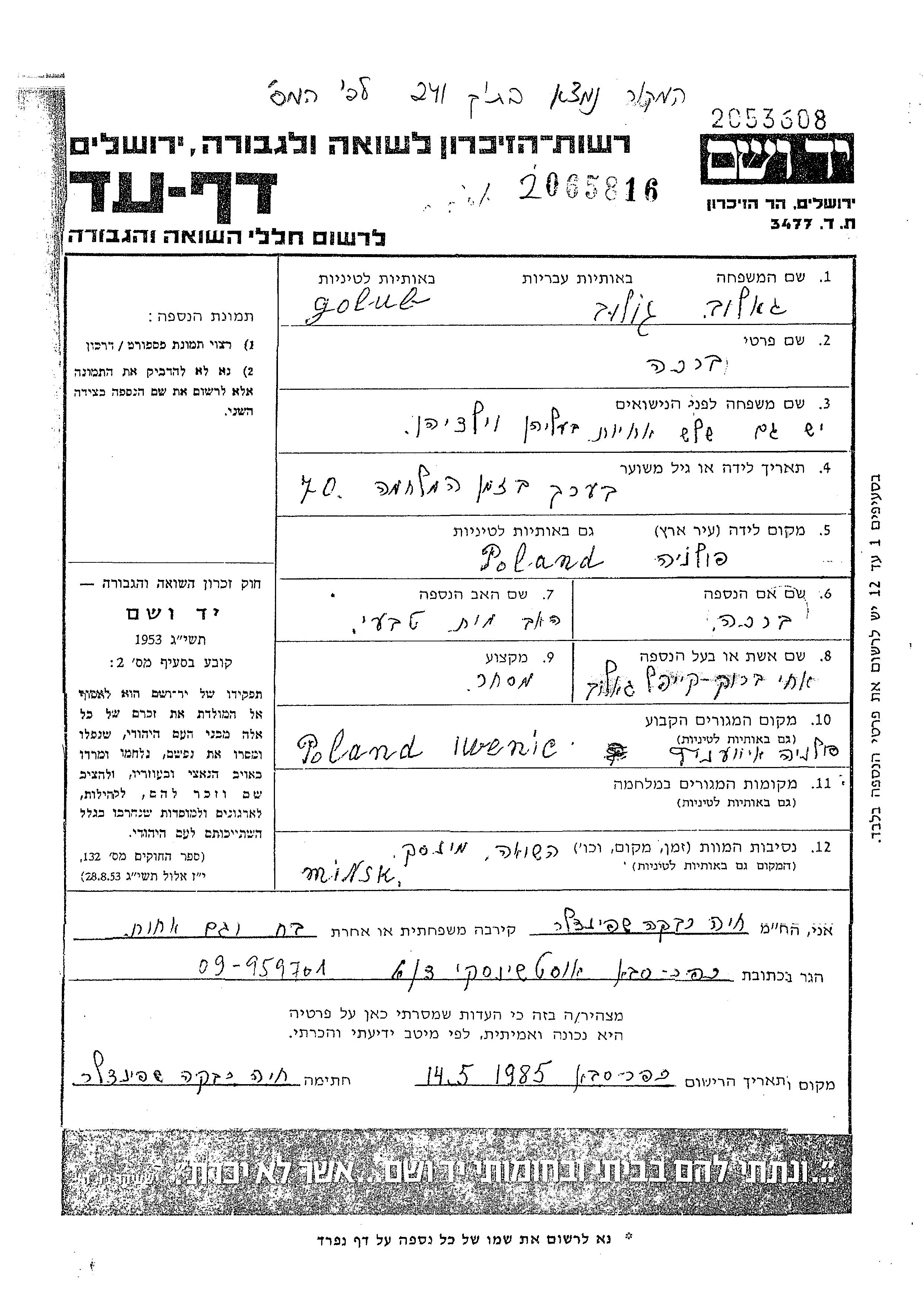 Keifel Golub wurde in Polen geboren. Er war der Sohn von Brakha. Er war Kaufmann/-frau. Vor dem Zweiten Weltkrieg lebte er in Iwieniec, Polen.