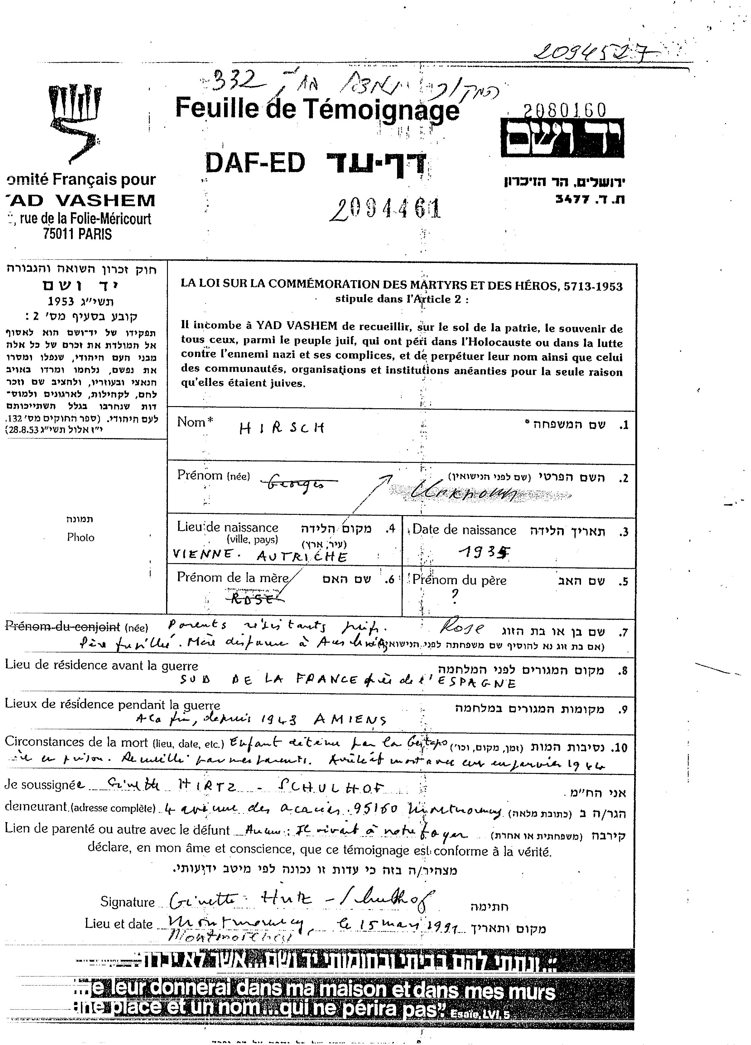 Vorname unbekannt Hirsch wurde im Jahr 1935 in Vienne, Österreich geboren. Er war der Sohn von Rose. Er war Ohne beruf und Kind. Vor dem Zweiten Weltkrieg lebte er in Frankreich. Während des Krieges war er in Amiens, Frankreich.